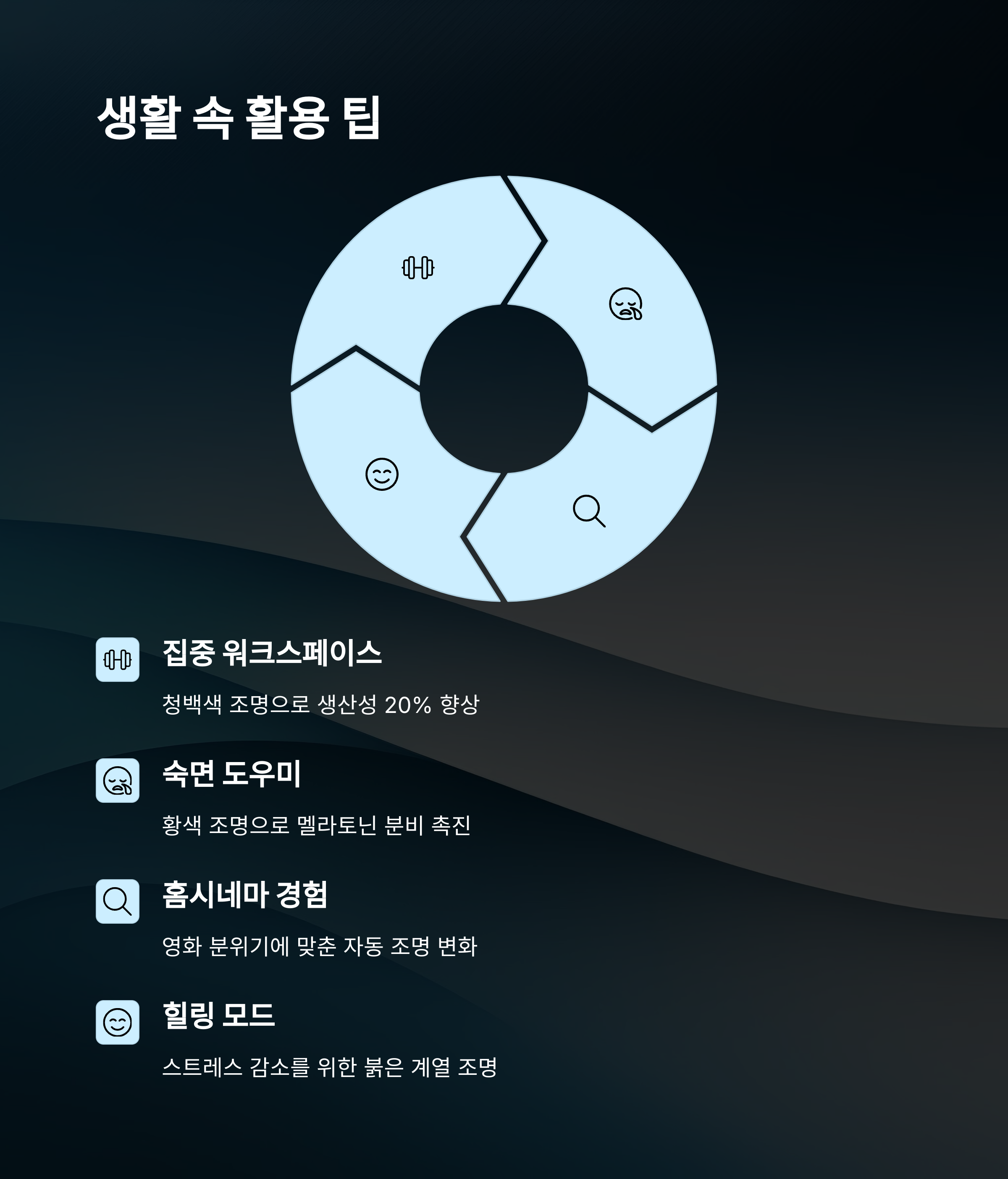이처럼 상황에 따라 조명을 바꾸면 그 순간의 몰입감이나 효율이 훨씬 달라져요. 그냥 조명 하나 바꿨을 뿐인데, 생활이 편리해지는 느낌! 스마트 조명이 주는 기쁨이 바로 이런 거예요 😄