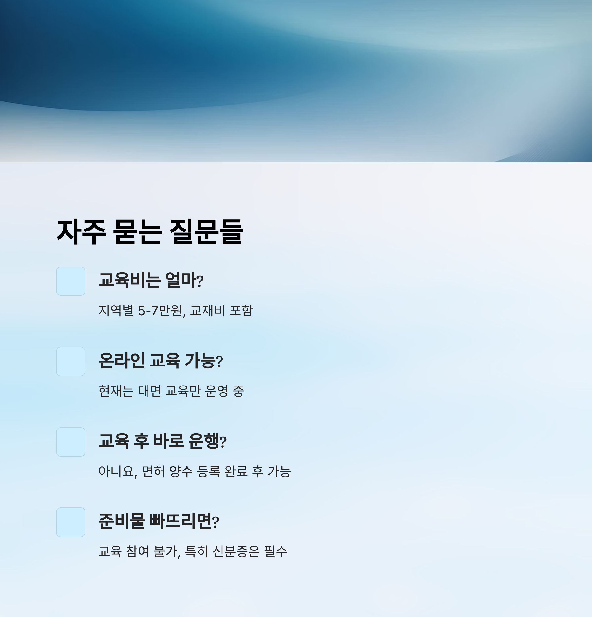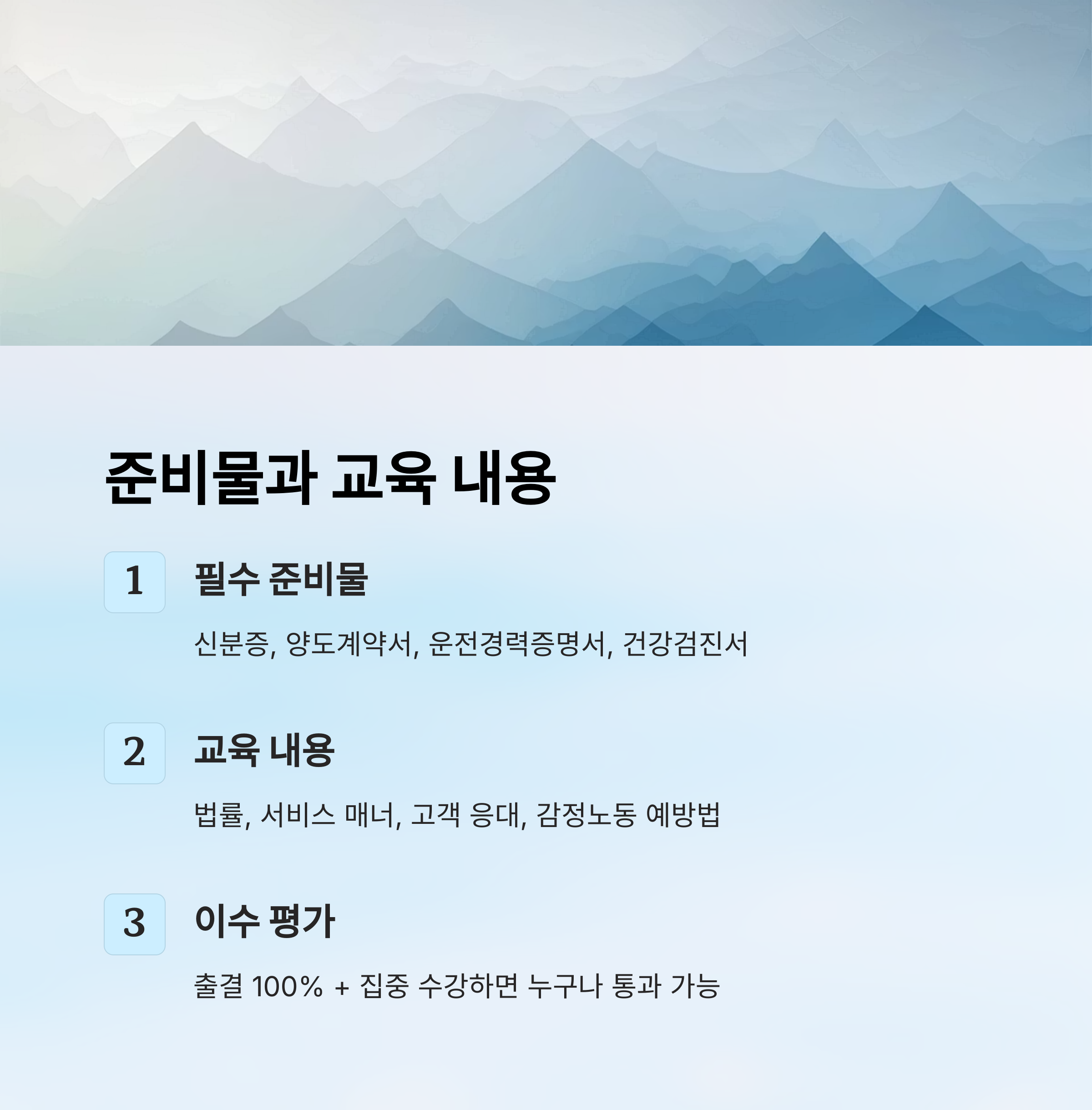 A8. 아니에요. 수료 후 면허 양수 등록이 완료되어야 정식 운행이 가능해요. 교육은 절차의 일부일 뿐이에요. 그다음은 구청 등록이 이어져요.