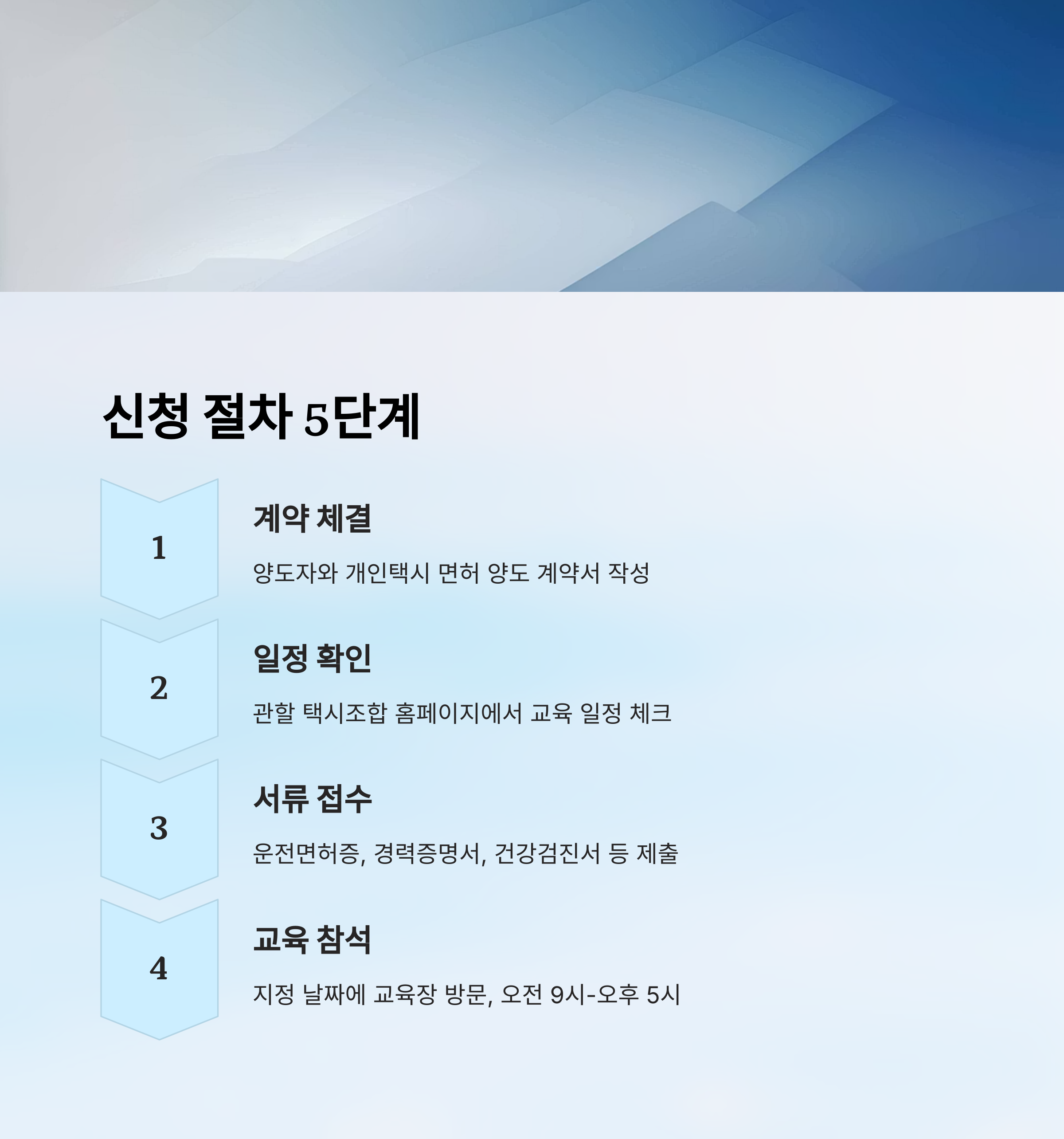 양수교육 신청은 생각보다 간단하지만 준비해야 할 서류와 절차가 있으니 꼼꼼히 따라야 해요. 먼저 개인택시 면허 양도 계약서를 작성한 뒤, 관할 택시조합 또는 운수단체 홈페이지를 통해 교육 일정을 확인해요.