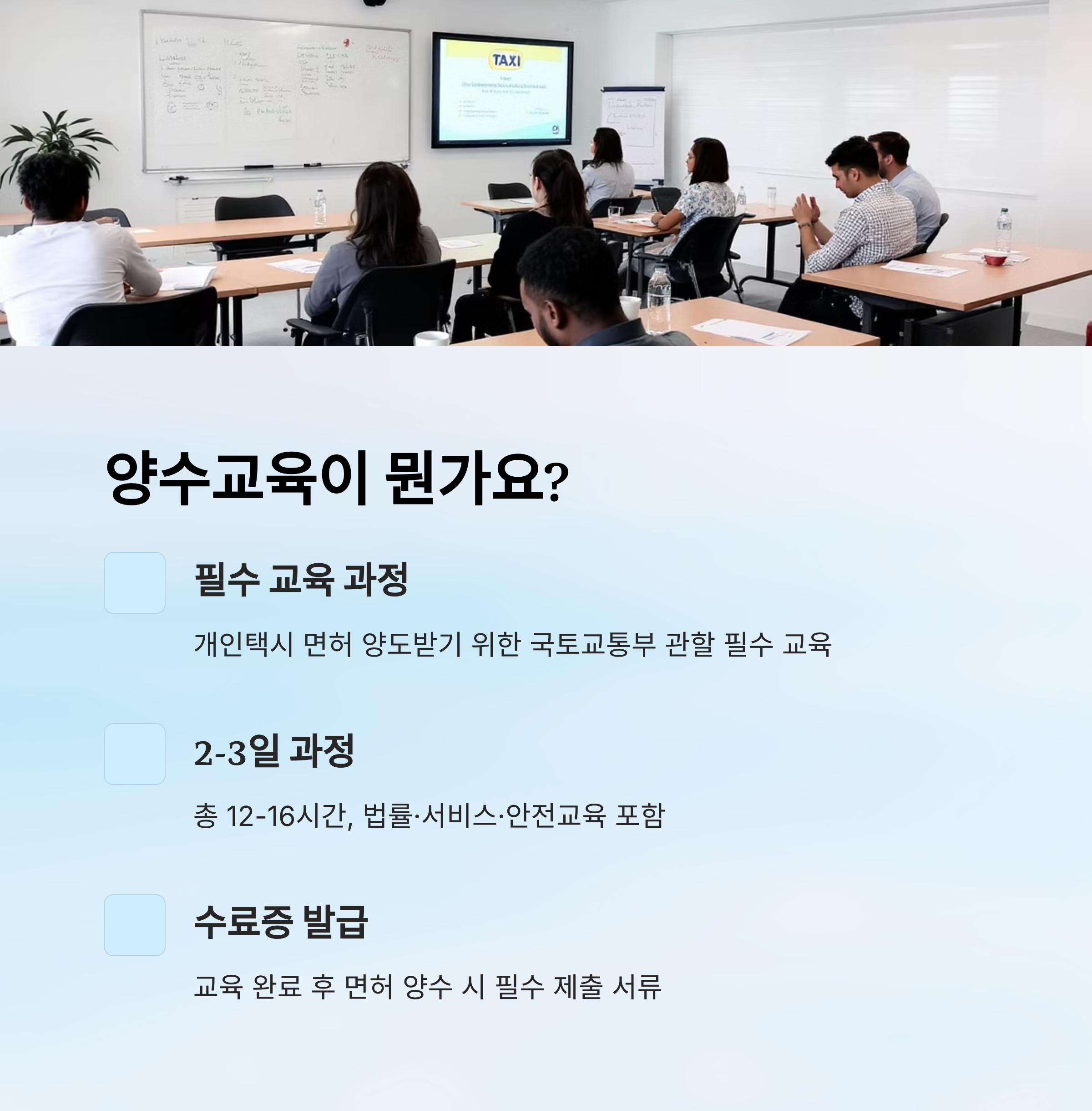 양수교육은 기존 개인택시 면허 소유자로부터 택시 면허를 양도받기 위해 필요한 필수 교육이에요. 이 교육은 개인택시 운전자로서 갖추어야 할 자격과 기본 소양을 갖추기 위한 목적을 가지고 있으며, 국토교통부가 관할하고 있는 제도랍니다.