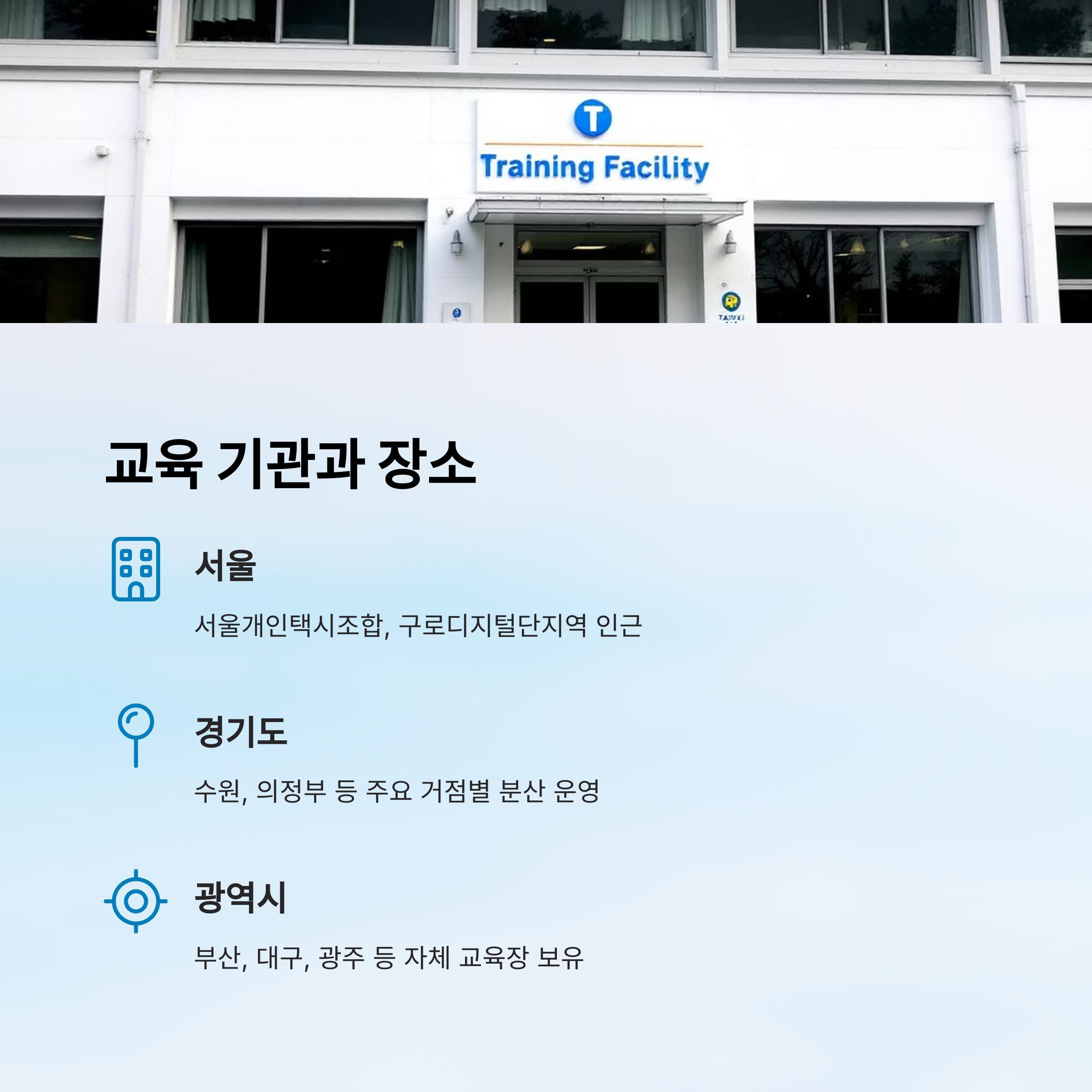 교육 장소는 대부분 조합 사무실 건물 내에 마련되어 있으며, 30~50명 규모의 강의실에서 집체 교육으로 진행돼요. 실습은 없지만 영상 자료나 시뮬레이션 기반의 교육도 포함돼 있어서 이해하기 쉽고 실무 감각을 키울 수 있어요.