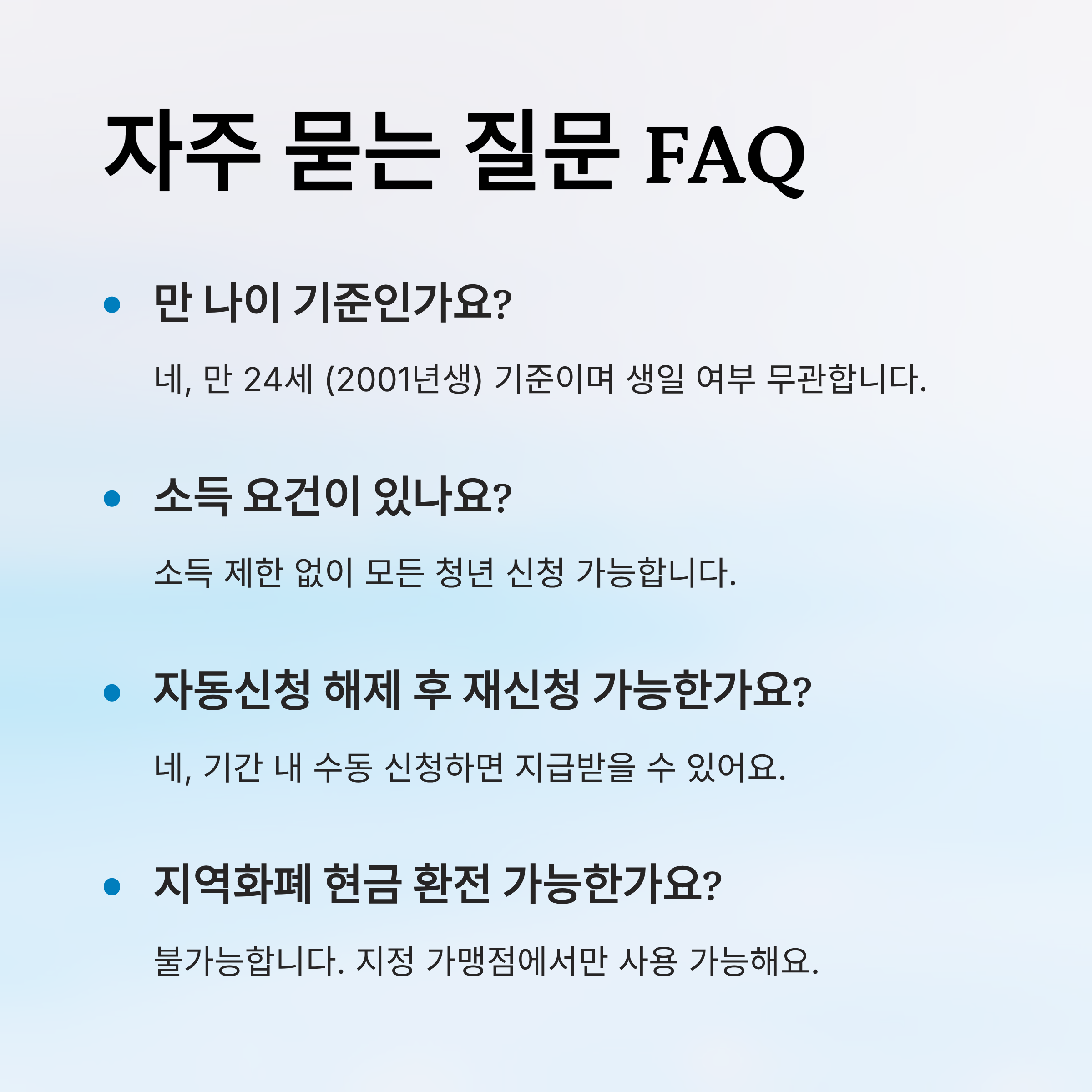 A1. 네, 지급 대상은 만 24세 청년이에요. 출생연도로 확인하며, 생일 여부와 관계없이 만 나이 기준으로 심사합니다.