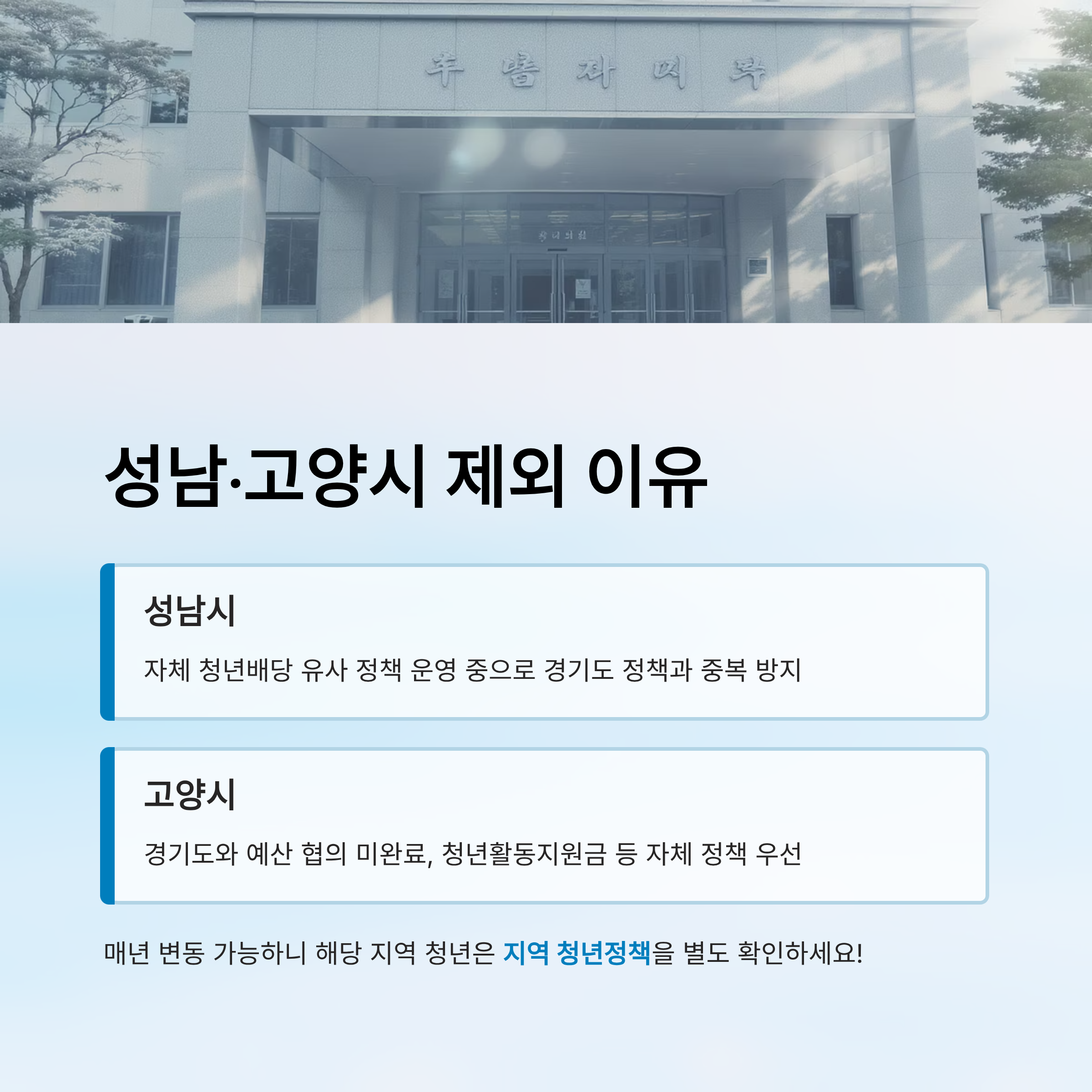 | 성남시 | ❌ 제외 | 자체 청년 지원 예산 운영 | 청년배당 유사정책 |