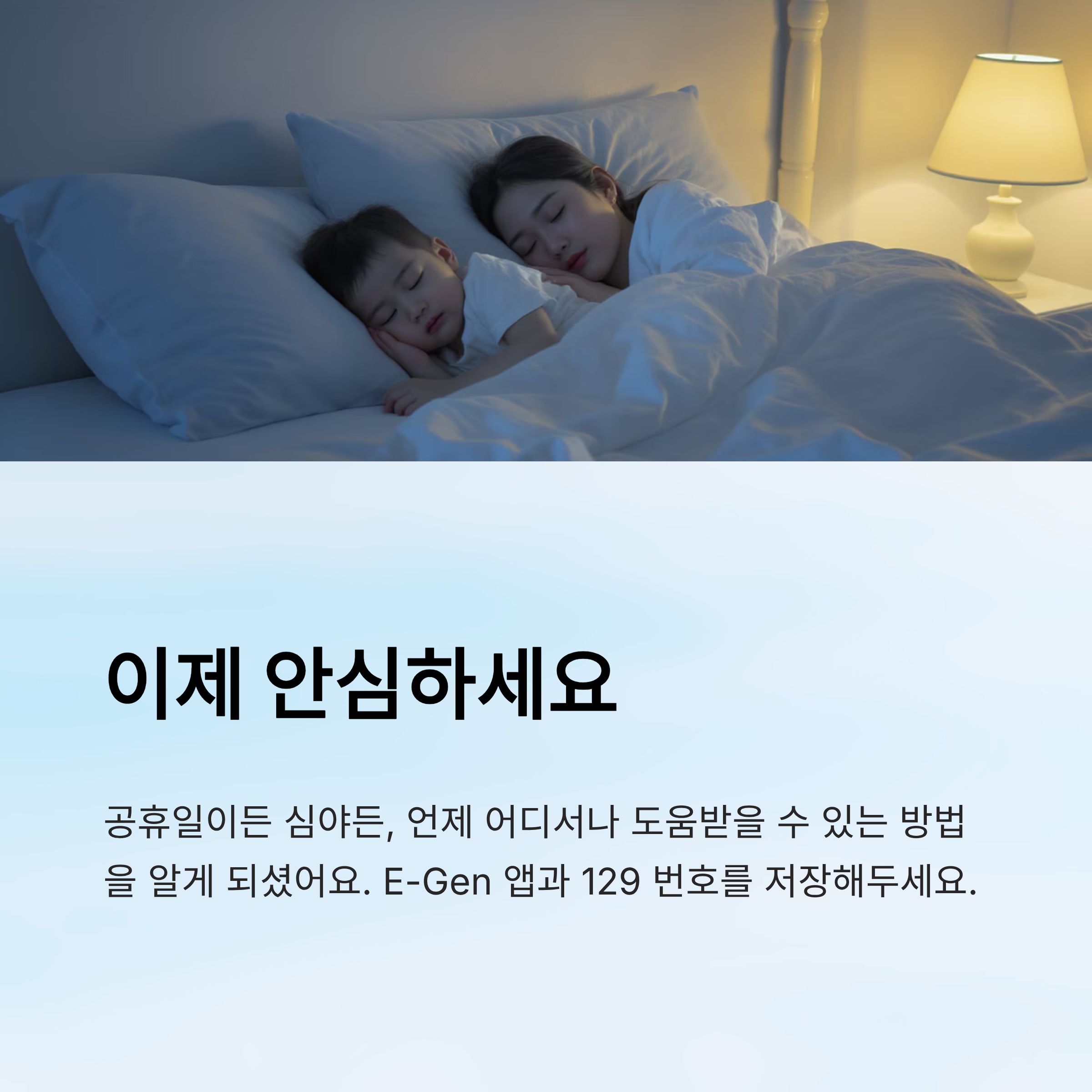 예를 들어 명절 당일 밤 11시에 아이가 열이 난다면, 어디로 가야 할지 당황하겠죠. 이때 129에 전화하면 지금 열려 있는 소아과나 응급실, 심야약국까지 바로 안내해줘요. 목소리로 상담받으니 더 안심돼요.