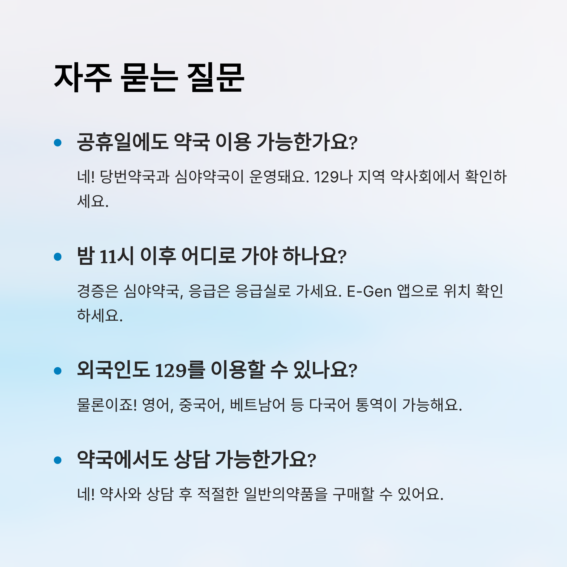 | 심야약국 | 22시~익일 2시(지역별 상이) | 두통, 감기, 복통 등 경증 질환 | 지역별 약사회 홈페이지 |