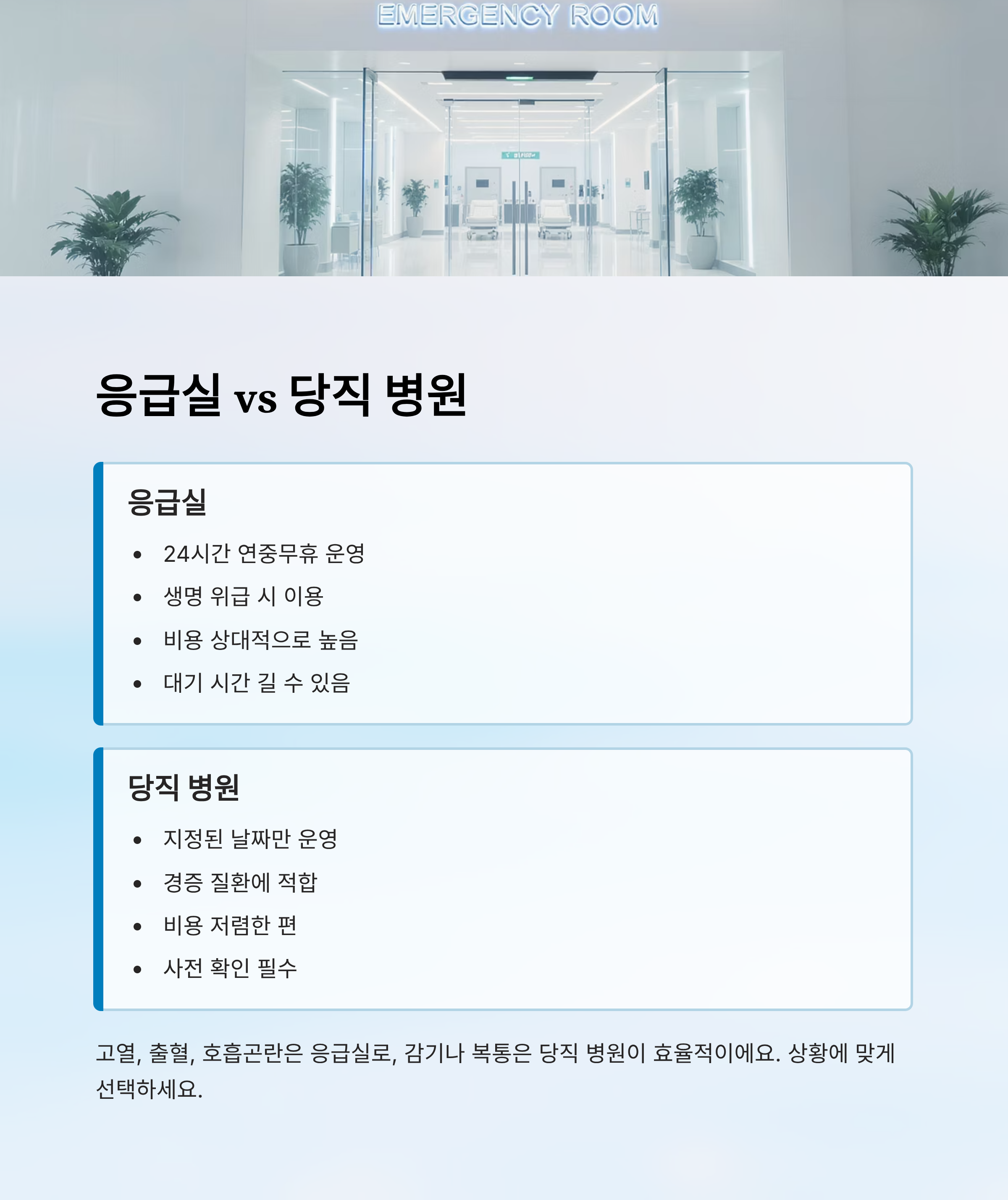 반면 당직 병원은 생명이 위급하지 않은 일반 진료가 필요한 상황에서 이용하면 돼요. 감기, 복통, 소화불량, 약 처방 등 비교적 가벼운 증상에 적합하고, 보통 내과나 소아과 중심으로 운영돼요.