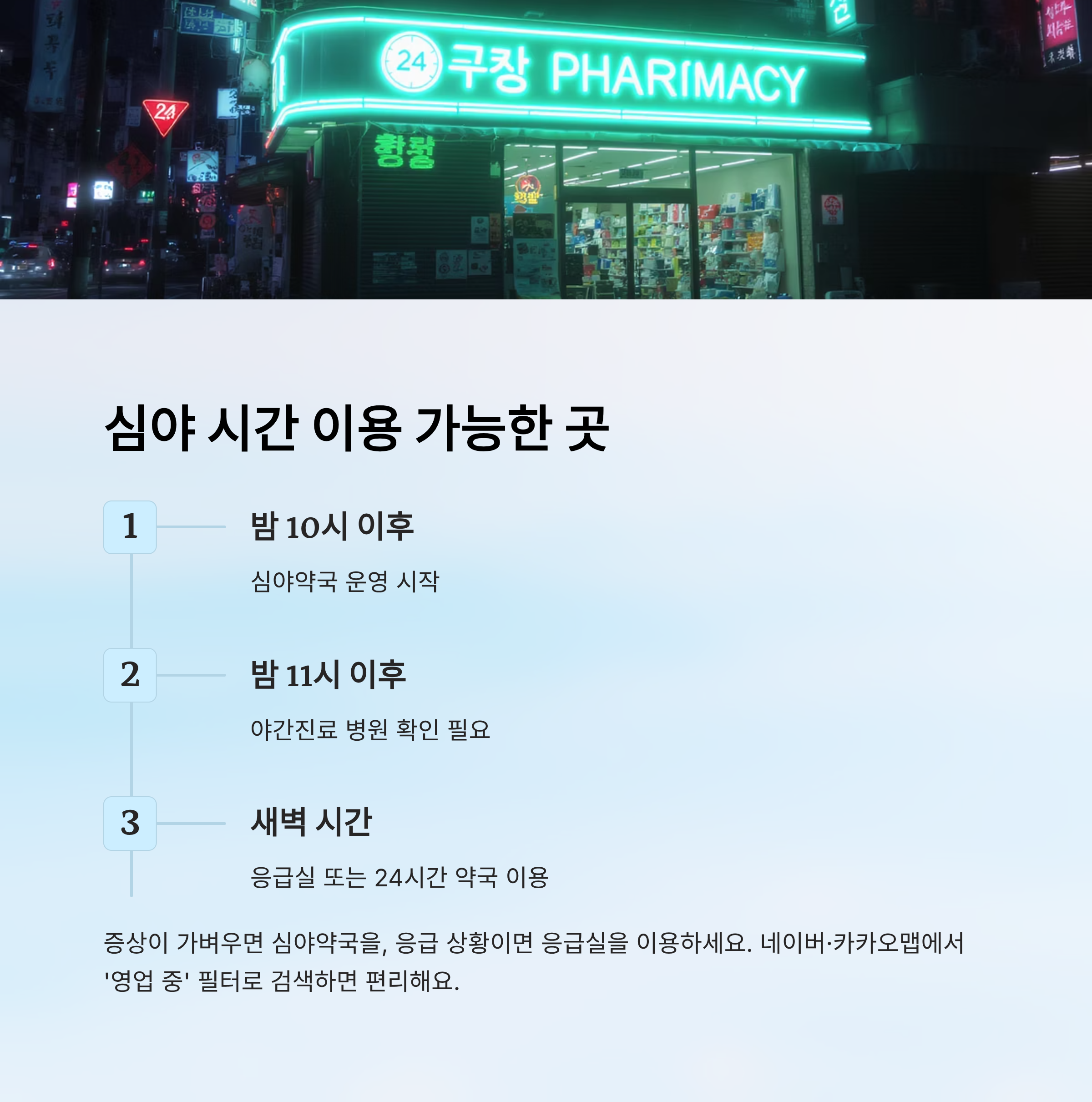 | 콧물/기침 | 체온 측정 + 수면 유도 | 심야약국 | 약사 상담 가능 |