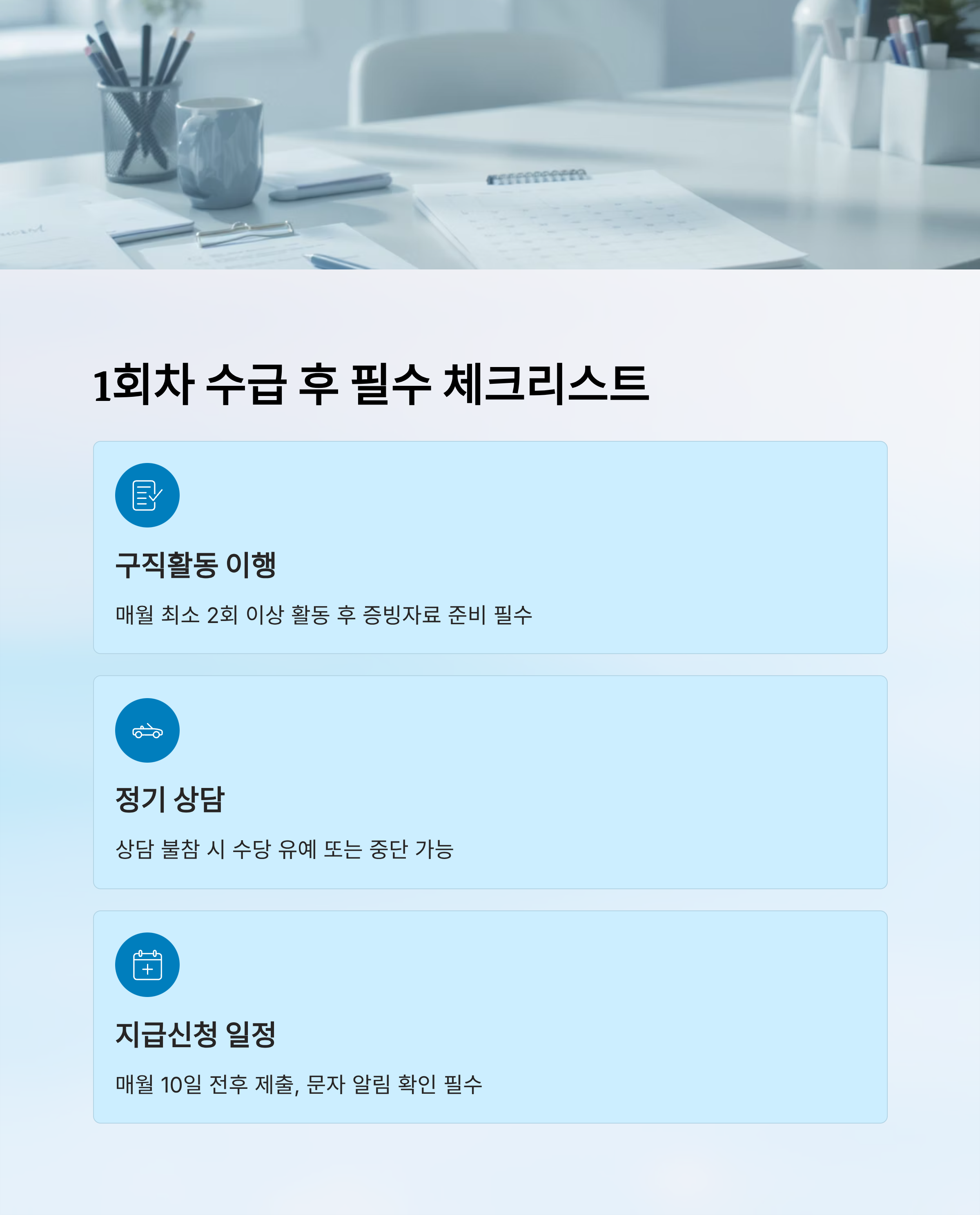 1회차 구직촉진수당을 무사히 받은 분이라면 축하드려요! 🎉 하지만 여기서 멈추면 안 돼요. 남은 5회차도 꾸준히 수령하기 위해선 정확한 기준과 일정에 따라 행동해야 해요. 2회차부터는 '조건 충족 여부'가 훨씬 더 엄격하게 관리되기 때문에, 놓치기 쉬운 항목들을 잘 챙겨야 해요.