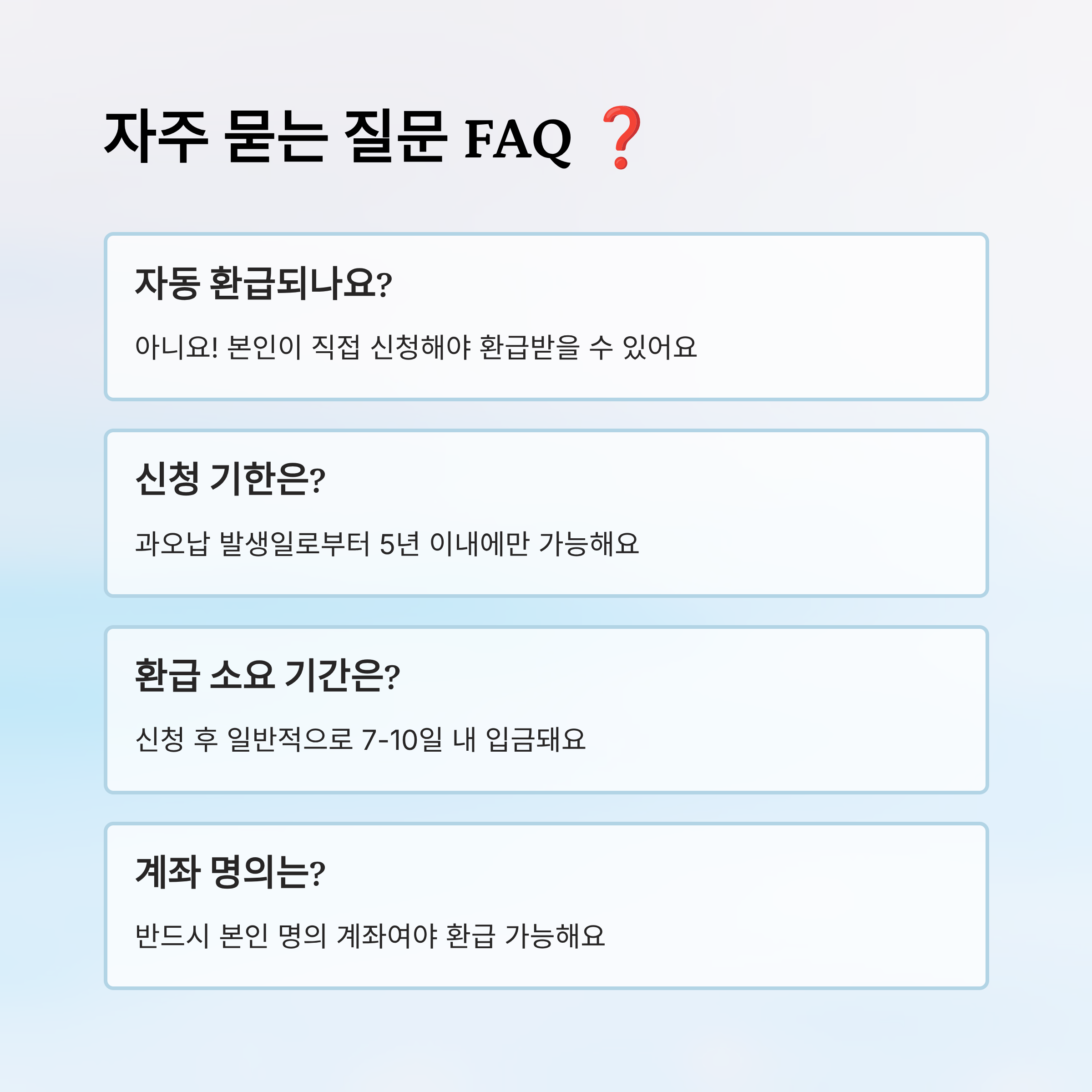 A2. 과오납이 발생한 날로부터 5년 이내에 신청해야 해요. 그 이후엔 소멸시효가 지나 환급이 불가능해요.