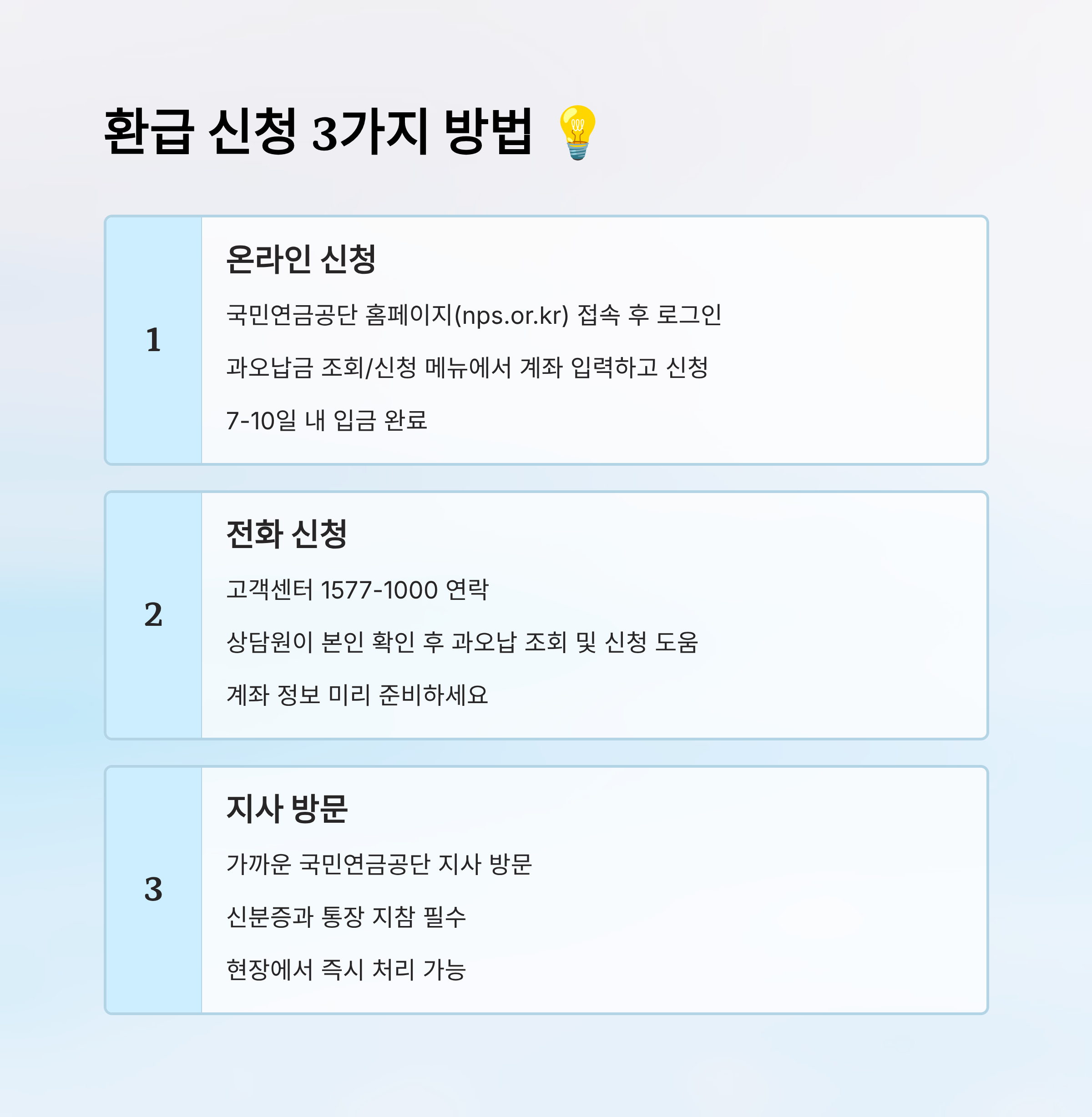 온라인 신청은 'nps.or.kr' 국민연금공단 홈페이지에 접속해 로그인한 뒤, “과오납금 조회/신청” 메뉴에서 본인 명의 계좌를 입력하고 바로 신청할 수 있어요. 환급금은 7~10일 안에 입금된답니다!