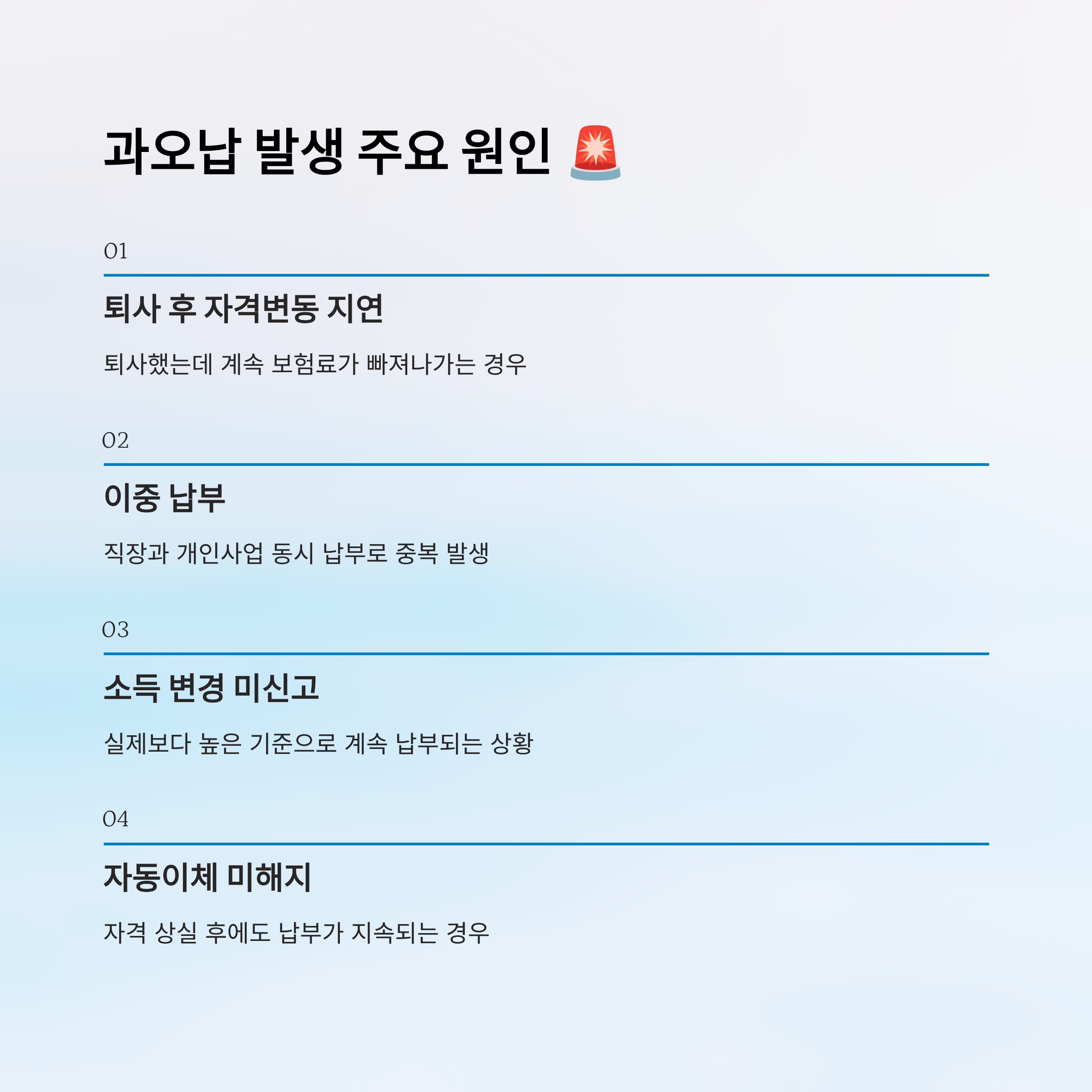 | 이중 납부 | 직장+개인사업 동시에 납부 | 이중 납부 여부 정기 확인 |