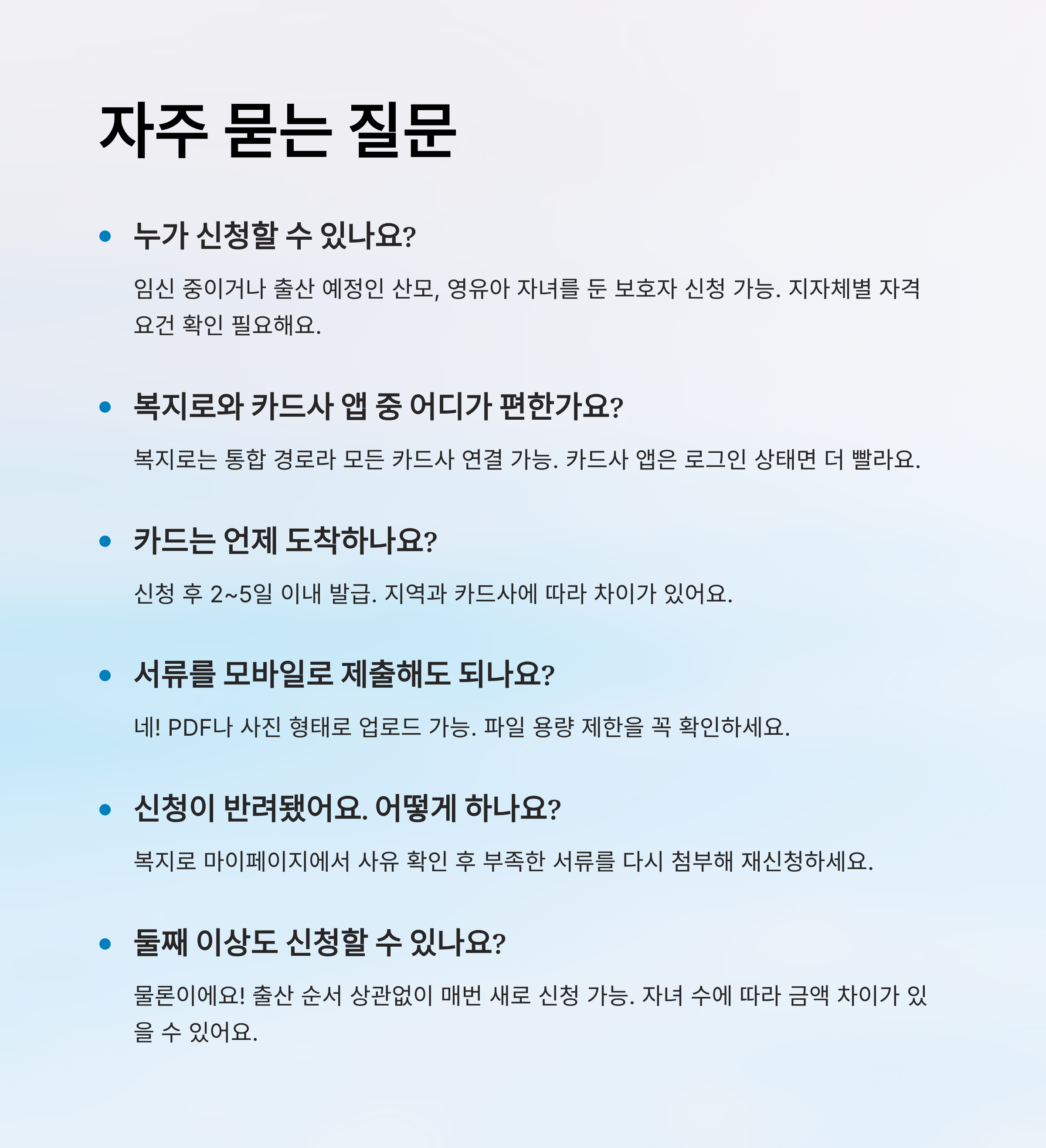 | A씨 (서울) | 복지로 + 신한카드 앱 | 5분 이내 | 앱 사용이 직관적 | 서류는 미리 모바일로 준비 |