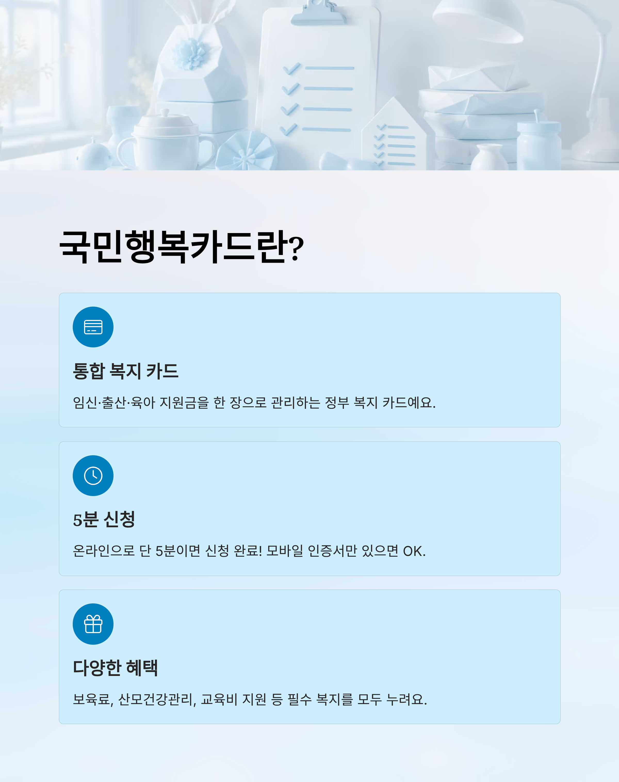 국민행복카드는 임신·출산·육아 지원부터 의료·교육비 혜택까지 다양한 복지서비스를 한 번에 누릴 수 있는 카드예요. 2025년 기준으로 신청 절차가 훨씬 간소화되어 온라인에서는 단 5분이면 신청을 완료할 수 있답니다. 카드 한 장으로 정부 지원을 바로 받을 수 있기 때문에 꼭 챙겨야 할 필수 복지 혜택이에요.