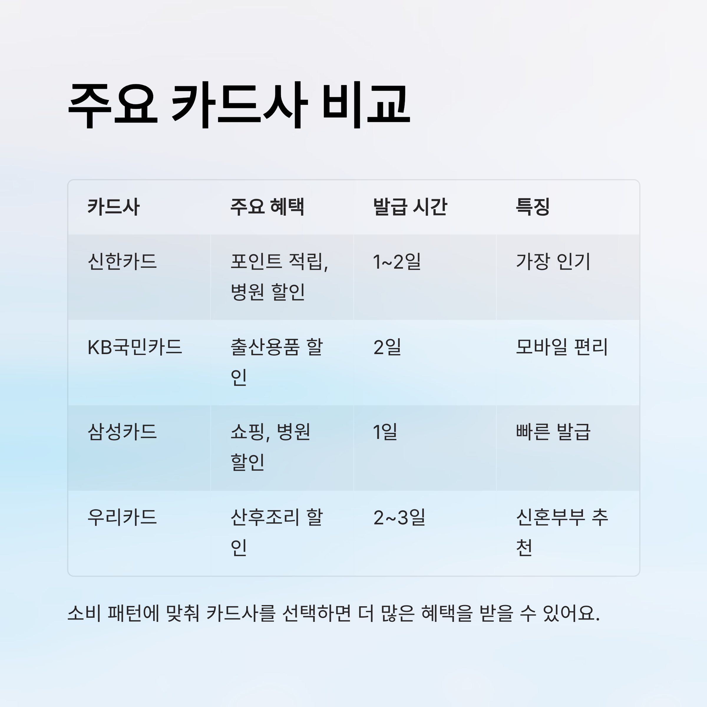 | 카드사 | 신청 채널 | 주요 혜택 | 발급 소요 시간 | 비고 |