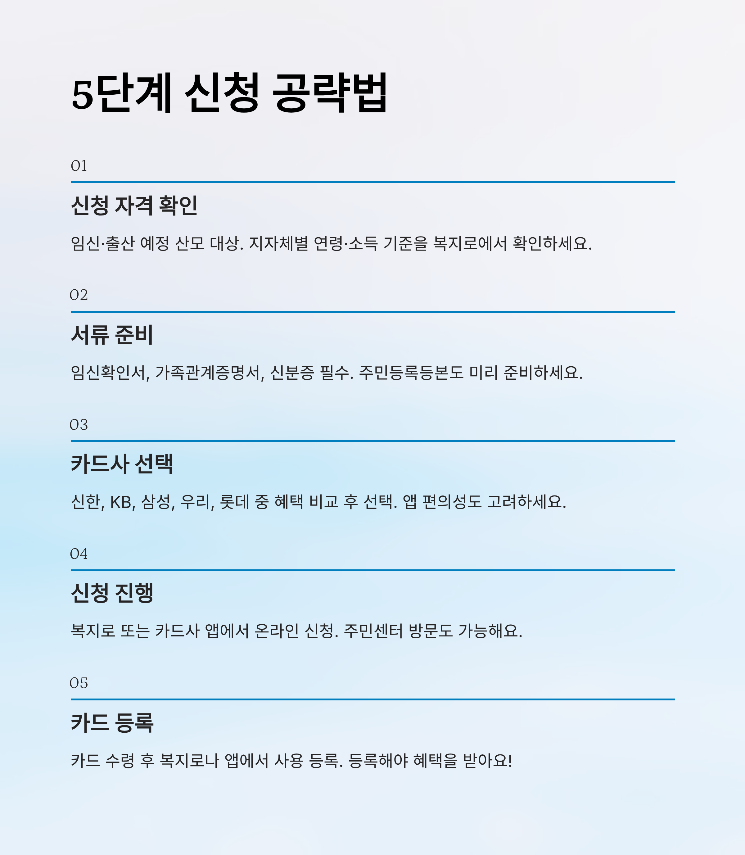 후기에서 공통적으로 나오는 핵심 팁은 바로 ‘서류 미리 준비하기’, ‘신청 전에 자격 확인하기’, 그리고 ‘카드사 혜택 비교 후 선택하기’예요. 이 세 가지만 잘 지키면 신청 절차는 정말 어렵지 않아요!