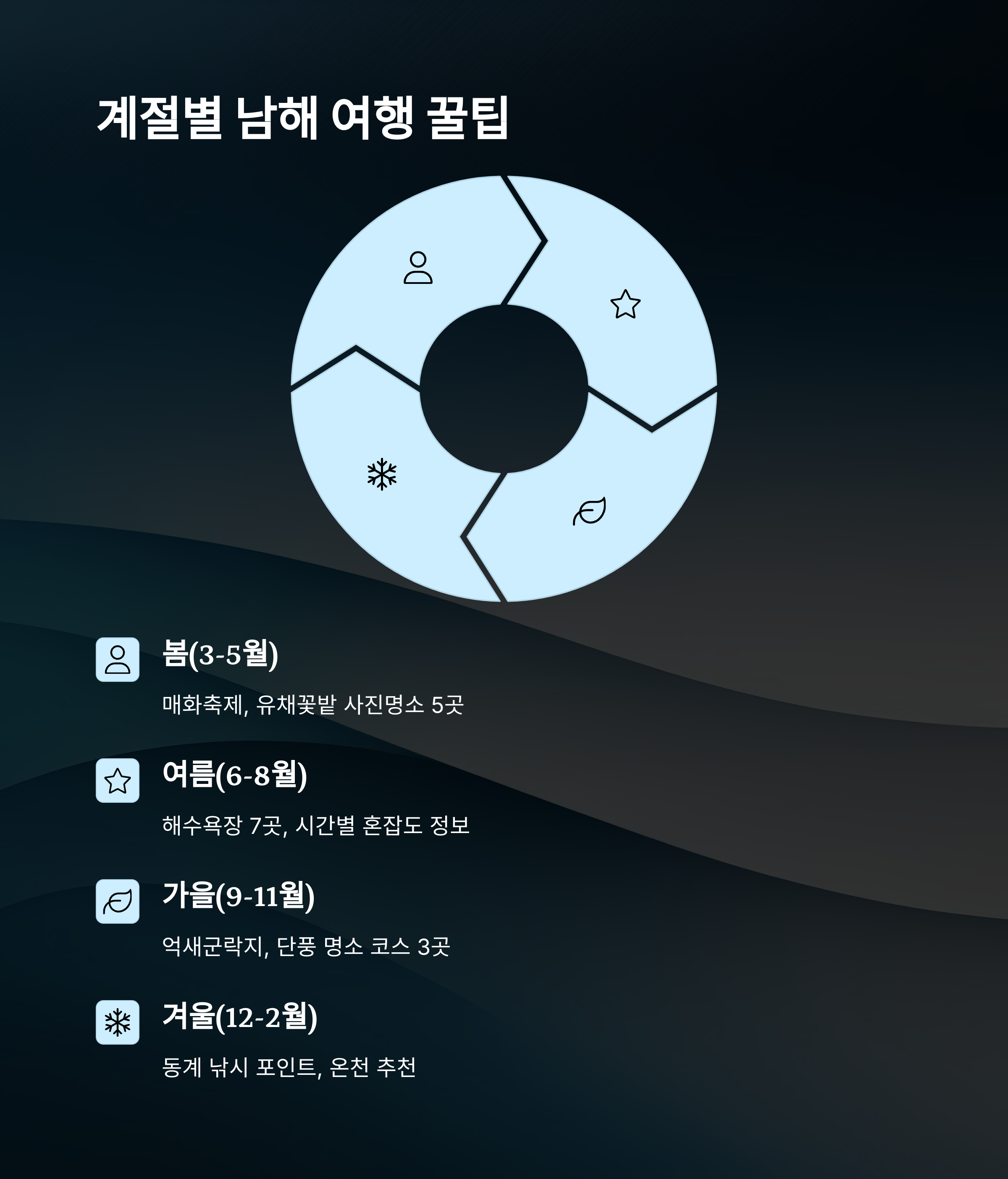 남해는 사계절 내내 매력이 넘치는 여행지예요. 계절마다 풍경도 다르고 즐길 거리도 달라서, 언제 가도 새로운 느낌이 들어요! 각 계절별로 꼭 알아두면 좋은 팁들을 모아봤어요!