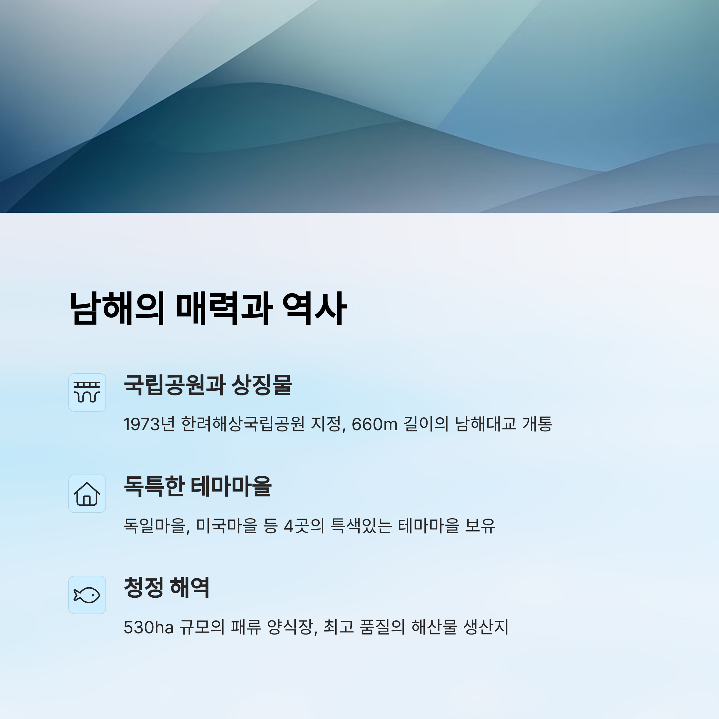 지금의 남해는 '독일마을', '남해대교', '다랭이마을' 같은 명소로 많은 사랑을 받고 있어요. 평화로운 분위기 속에서 걷다 보면, 과거와 현재가 조화를 이루는 남해만의 매력에 푹 빠지게 될 거예요.