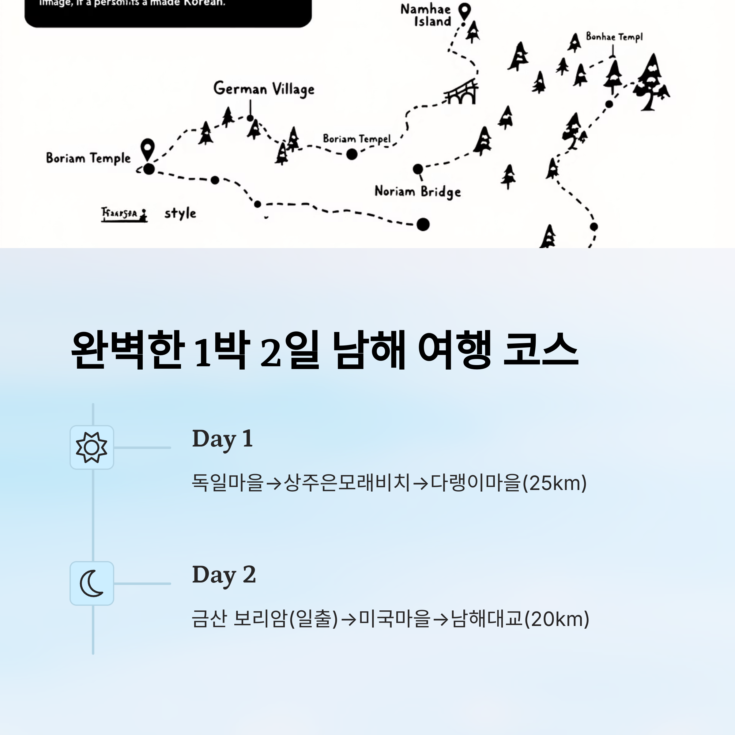 남해는 1박 2일이면 주요 포인트를 꽤 알차게 돌 수 있어요! 시간대별로 짜본 코스 추천할게요. 체력 부담도 적고, 남해의 자연과 맛집을 모두 즐길 수 있게 구성했어요. ✨
