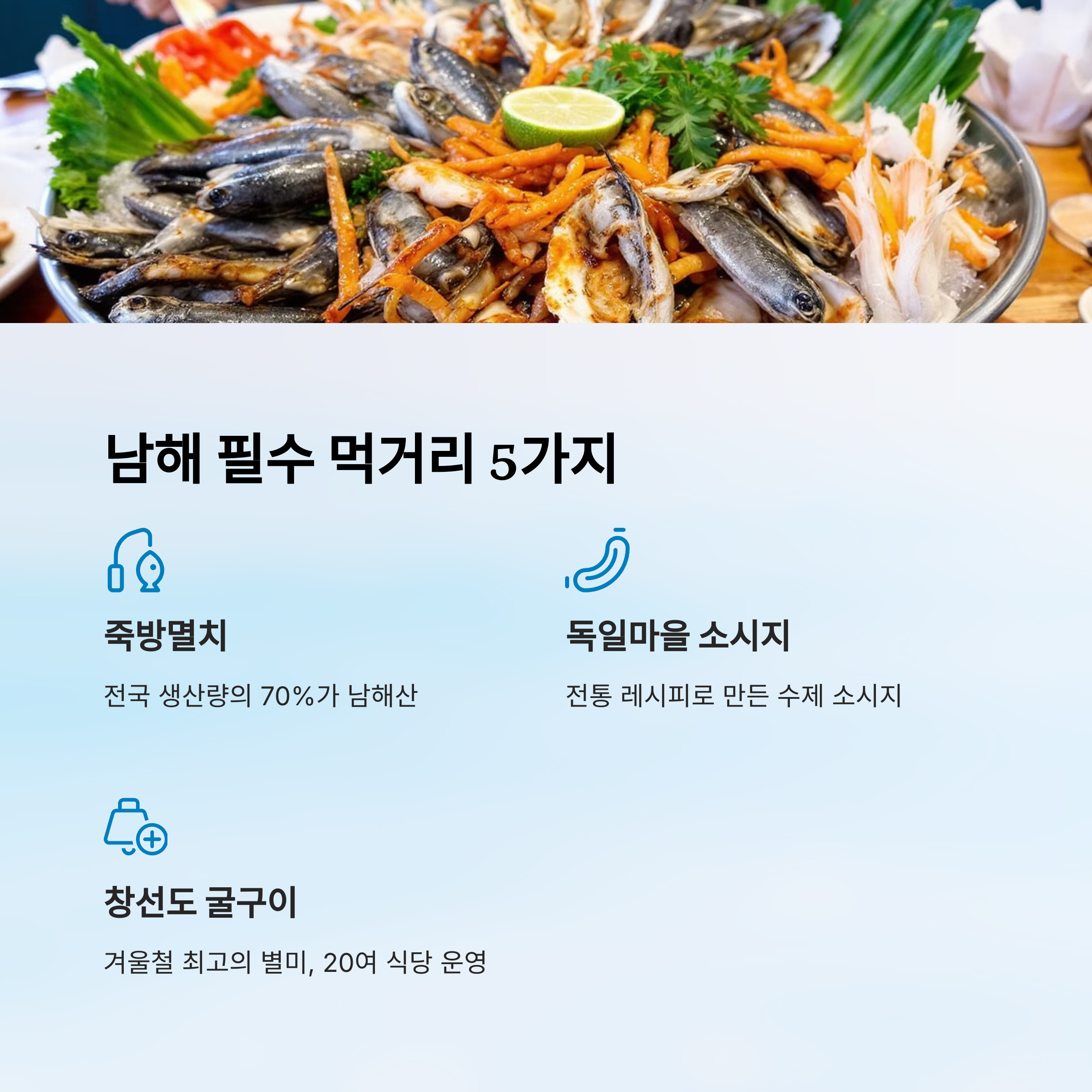 여행에서 빼놓을 수 없는 게 바로 '먹는 재미'죠! 남해는 바다와 산이 함께 있어 다양한 신선한 먹거리를 맛볼 수 있어요. 특히 남해에서만 먹을 수 있는 특색 있는 음식들이 많답니다.