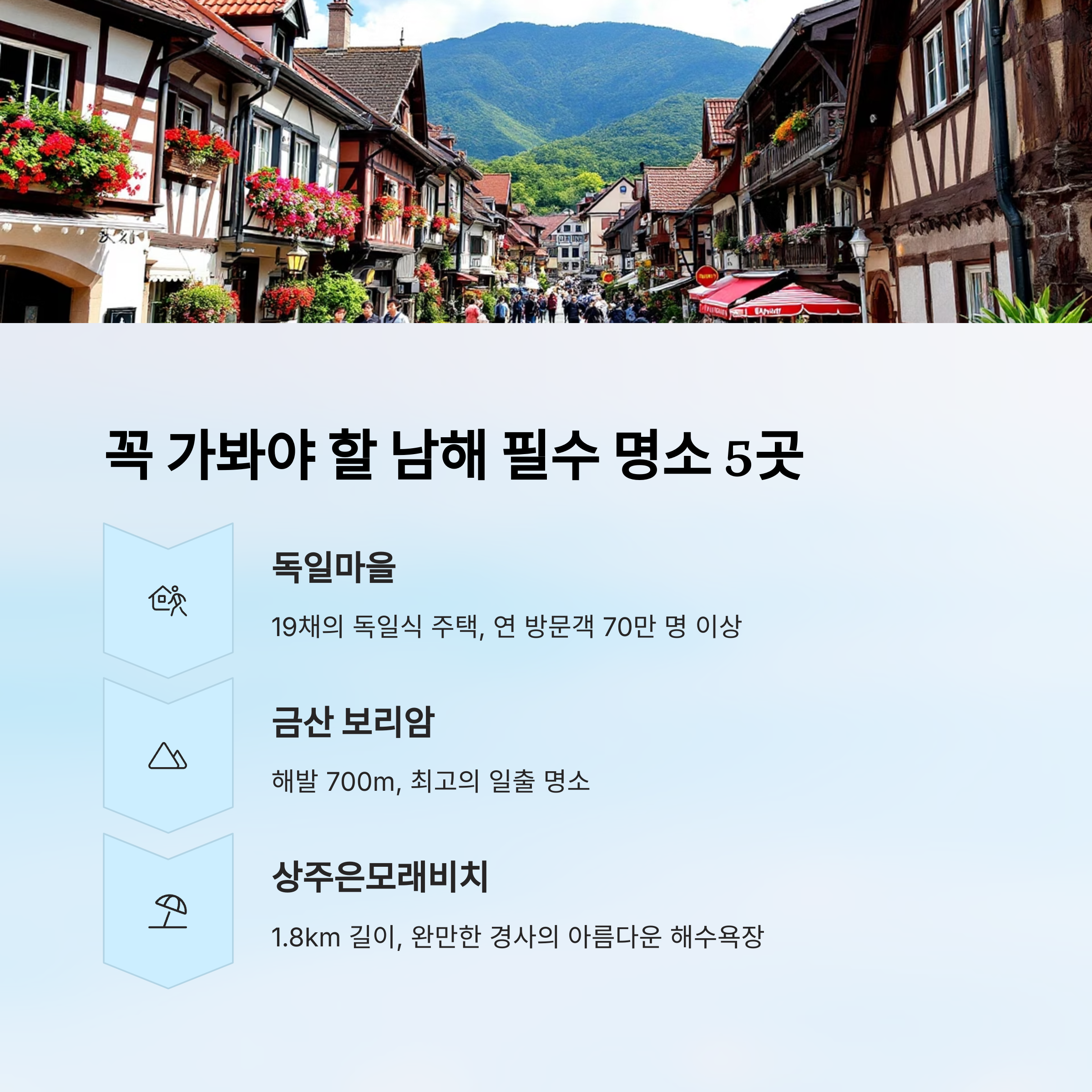 첫 번째는 바로 '남해 독일마을'이에요! 예쁜 색감의 독일풍 주택과 파란 하늘이 환상적으로 어울려서 사진 찍기 딱 좋은 곳이죠. 맥주 한잔 즐기며 여유를 느껴보는 것도 추천해요.