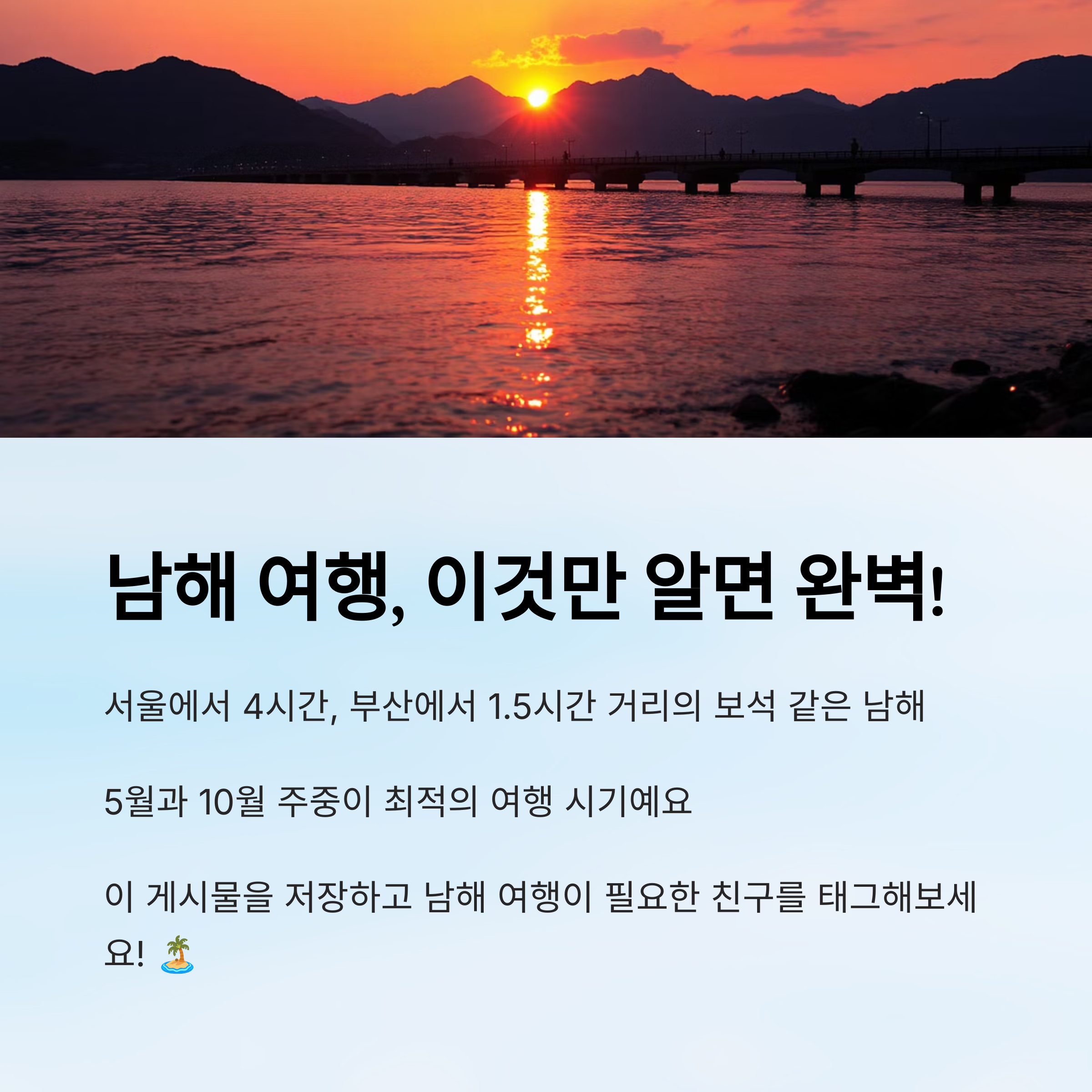 특히 자연과 조화를 이룬 여행지가 많아 가족 단위 여행객, 연인, 친구 모두 만족할 수 있어요. 남해는 다녀오면 꼭 다시 가고 싶어지는 그런 특별한 매력을 지녔어요. 오늘은 남해여행을 알차게 즐길 수 있는 방법을 낱낱이 소개할게요!