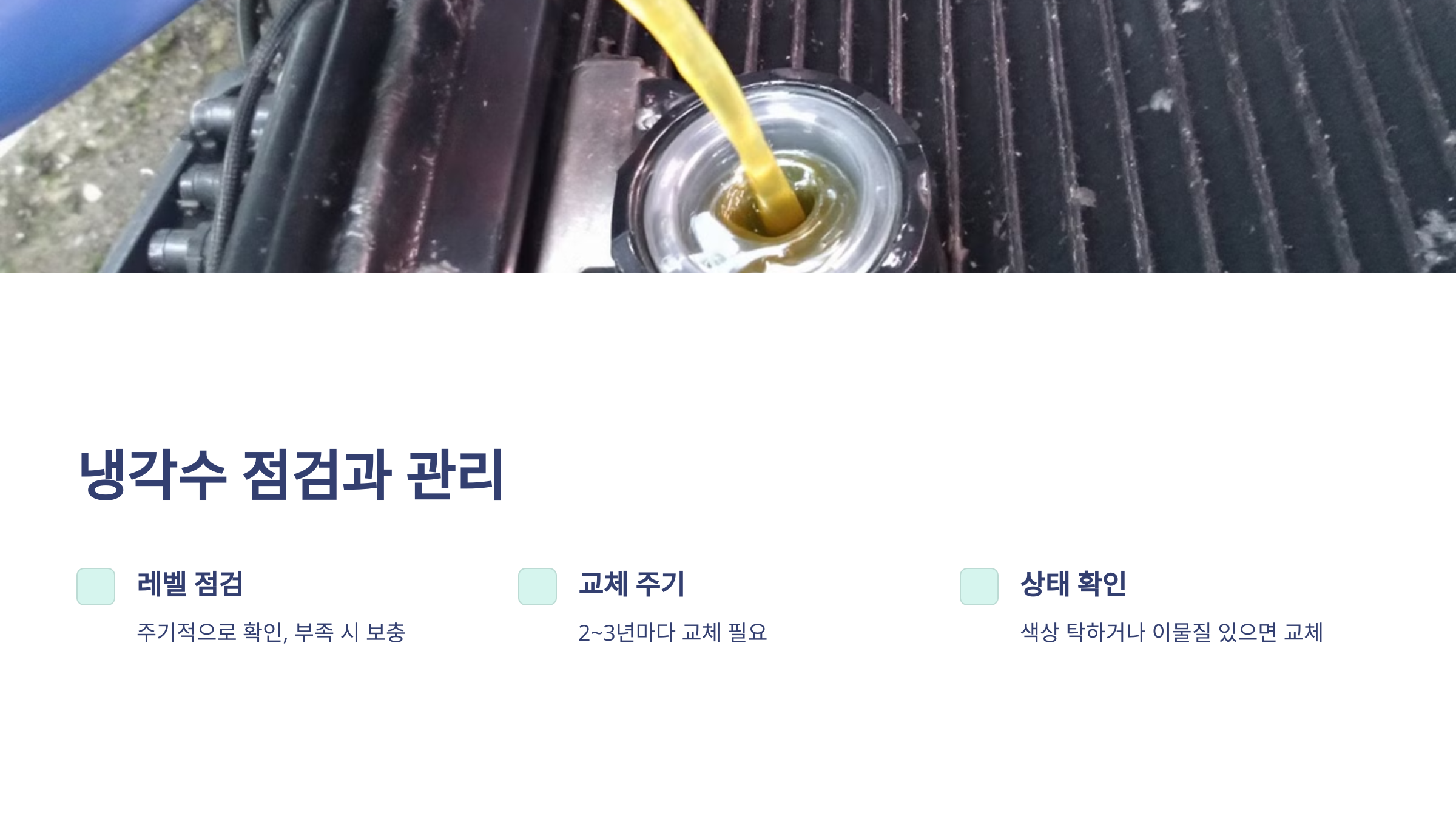냉각수 레벨을 주기적으로 점검하고 부족하면 즉시 보충하세요.