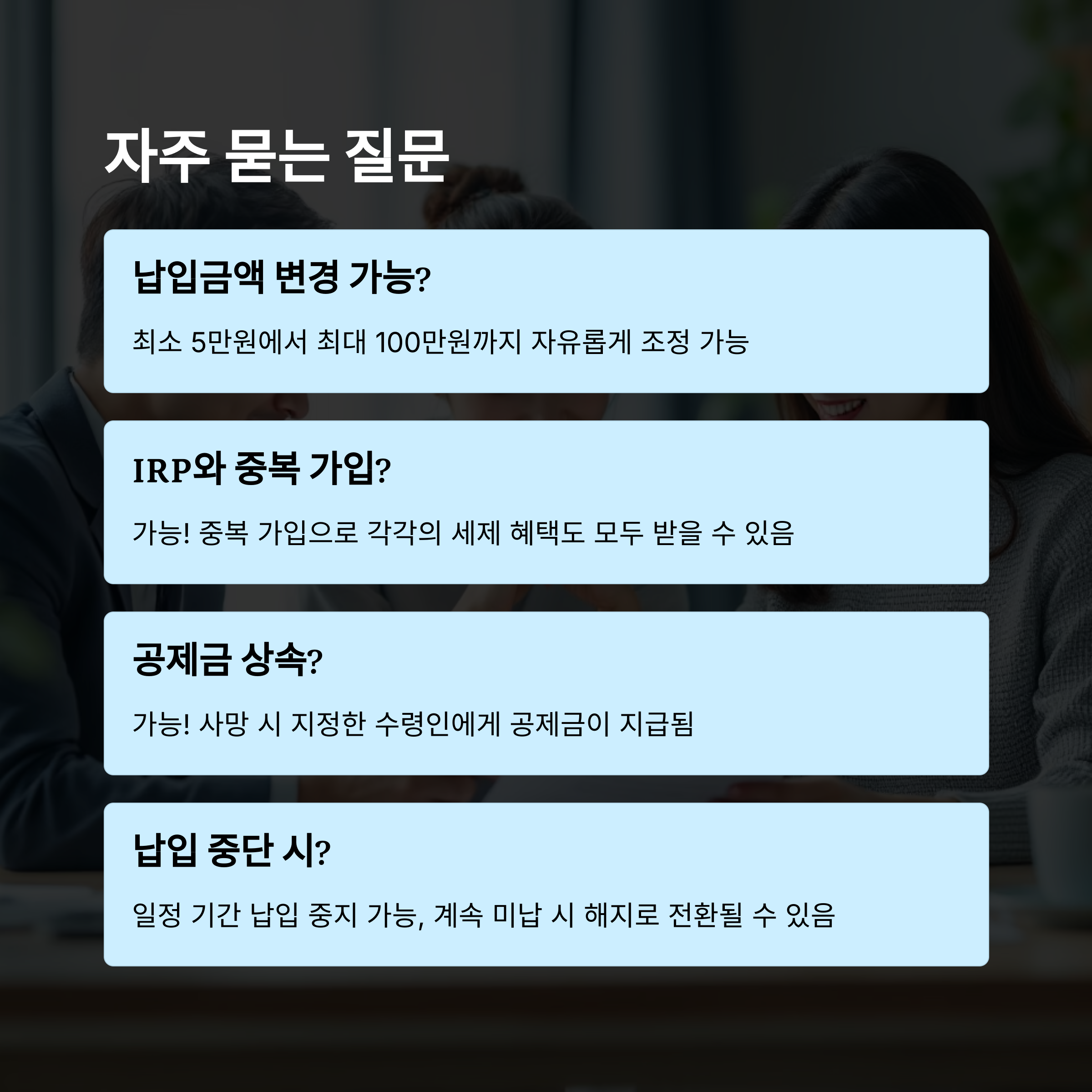 | 개인형IRP | 근로자, 자영업자 | 금융기관 | 55세 이후 | 연 최대 700만 원 세액공제 |