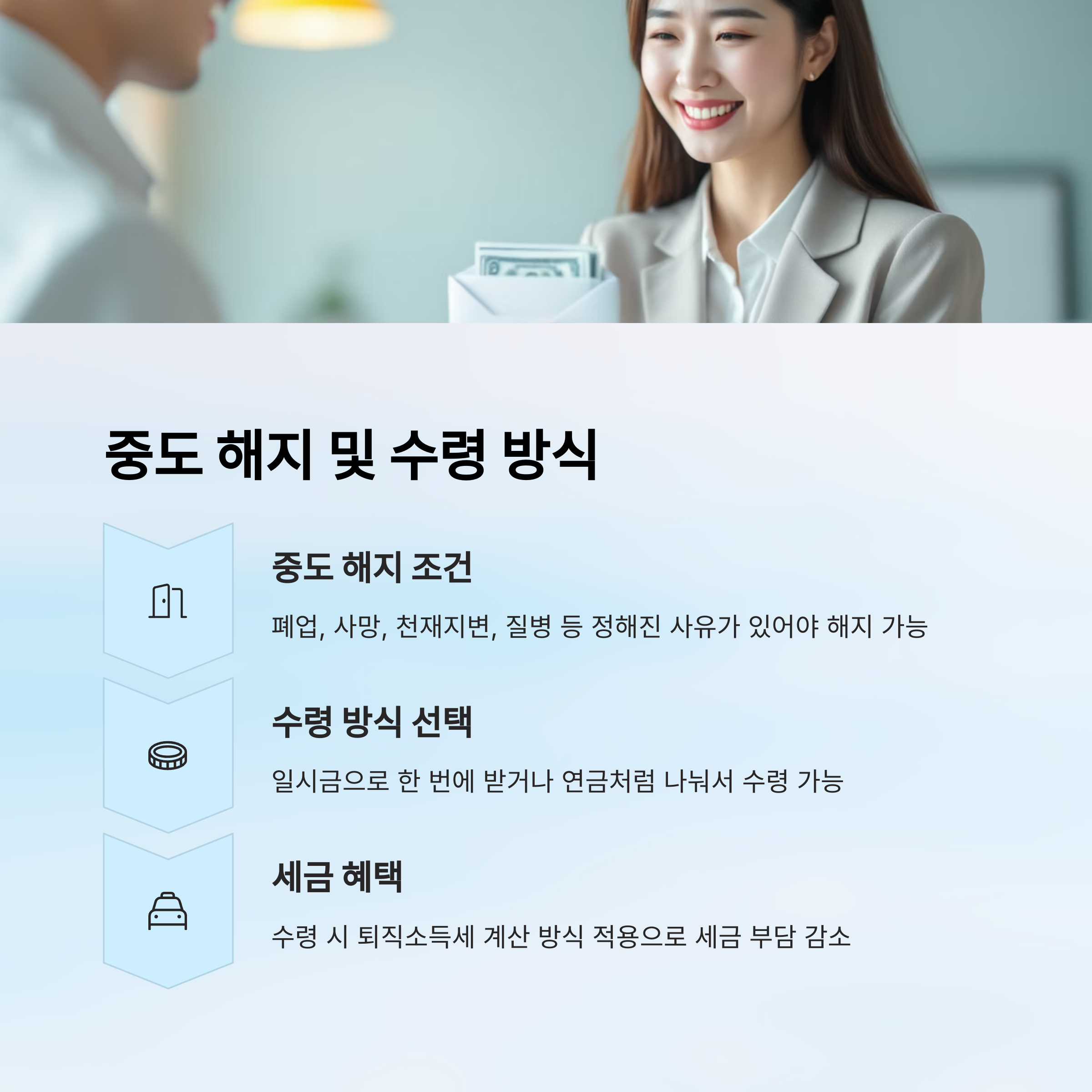 퇴직금 제도에서 가장 민감한 부분이 바로 해지와 수령 방식이에요. 노란우산공제는 중도 해지가 허용되지만 무조건은 아니고, 폐업, 사망, 천재지변, 질병 등 정해진 사유가 있어야 해요. 단순히 마음이 바뀌었다고 해지하는 건 어렵지만, 사업을 접는다면 해지가 가능하다는 점은 이해하기 쉬워요.