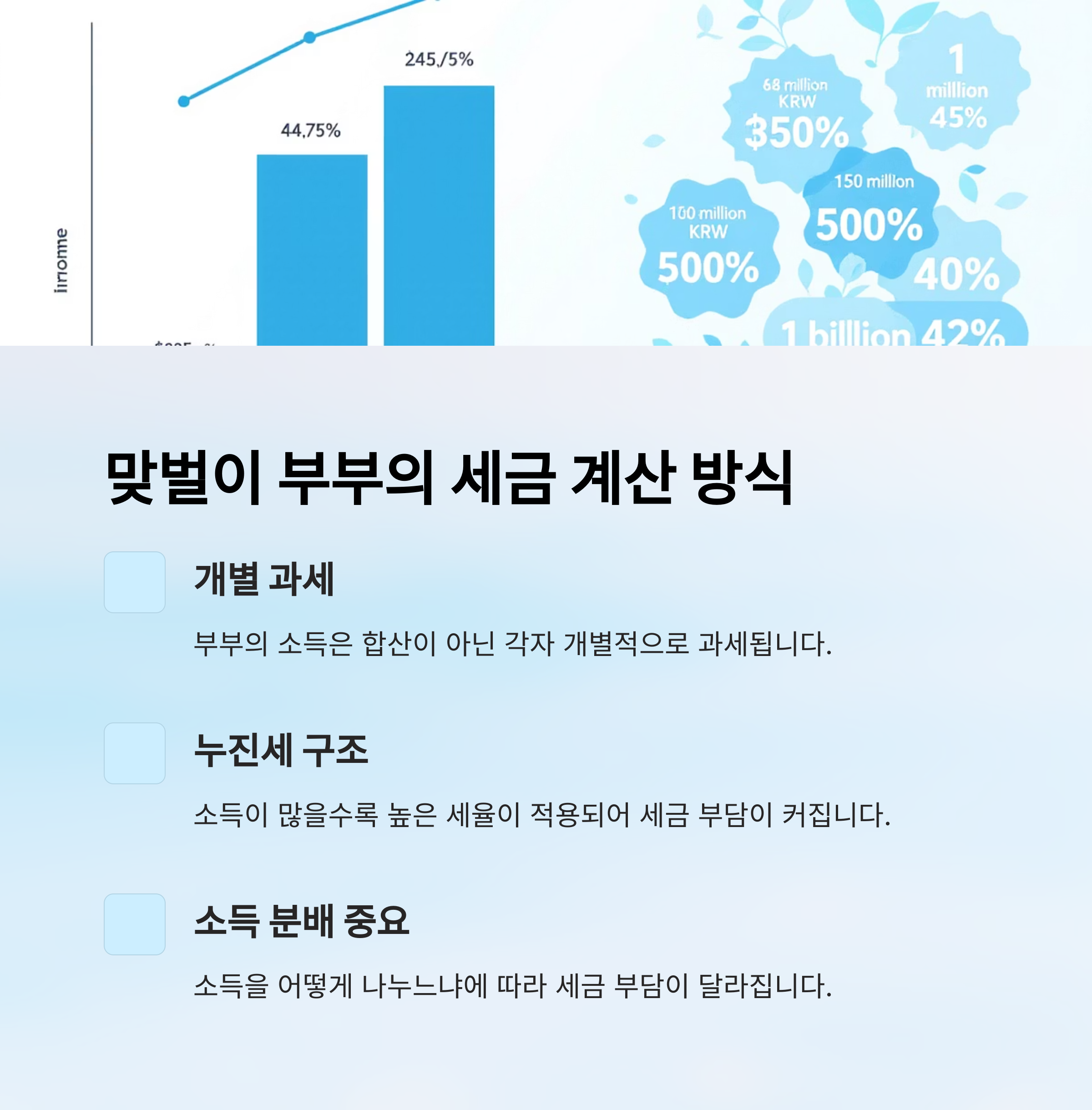 맞벌이 부부의 소득세는 부부의 소득을 합산하여 계산하는 것이 아니라, 각자 개별적으로 과세되어요. 즉, 소득이 높은 사람이 더 많은 세금을 부담하게 되죠.