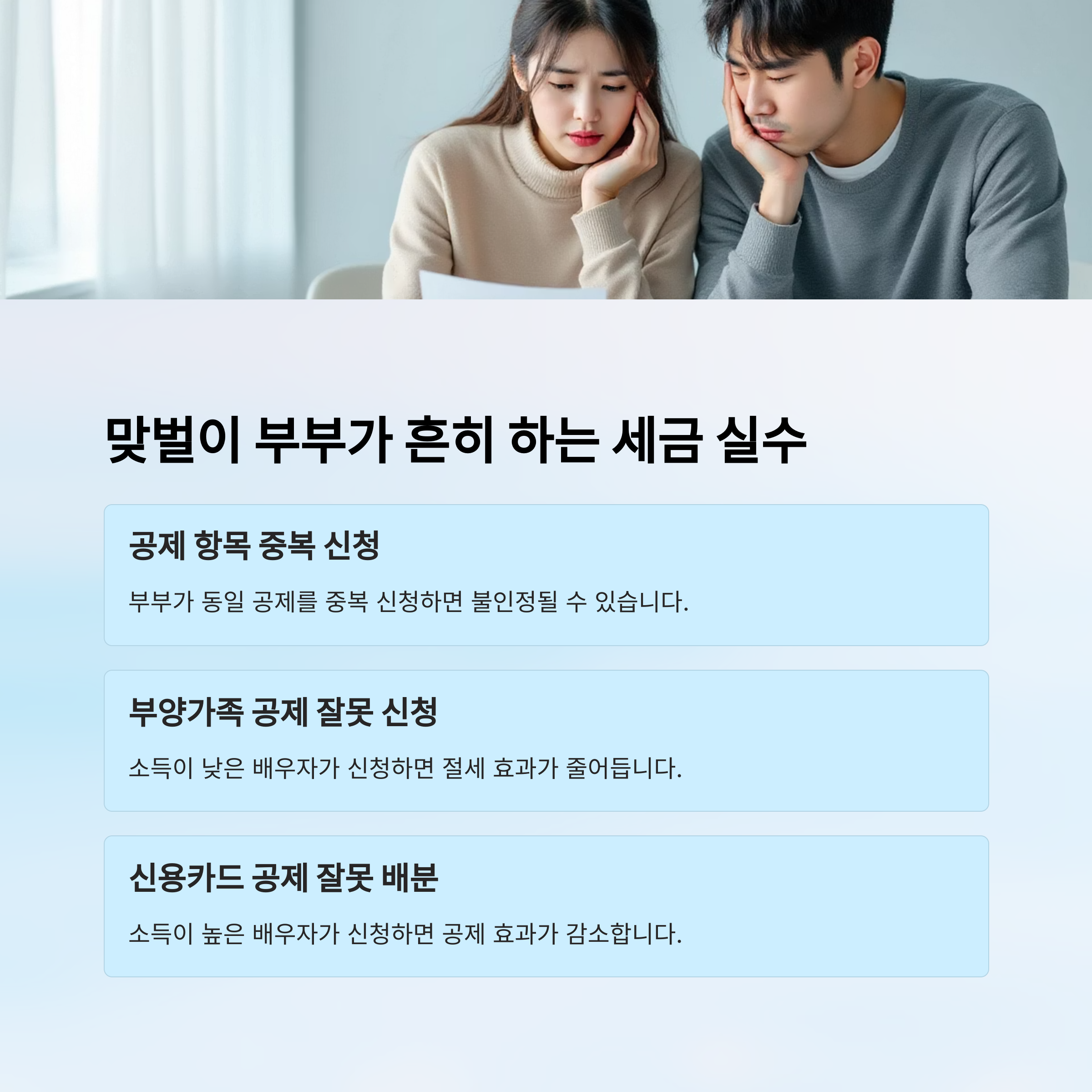 맞벌이 부부가 세금 신고를 할 때 흔히 하는 실수들이 있어요. 이러한 실수를 피하면 불필요한 세금 부담을 줄이고, 합법적인 절세 효과를 극대화할 수 있어요!