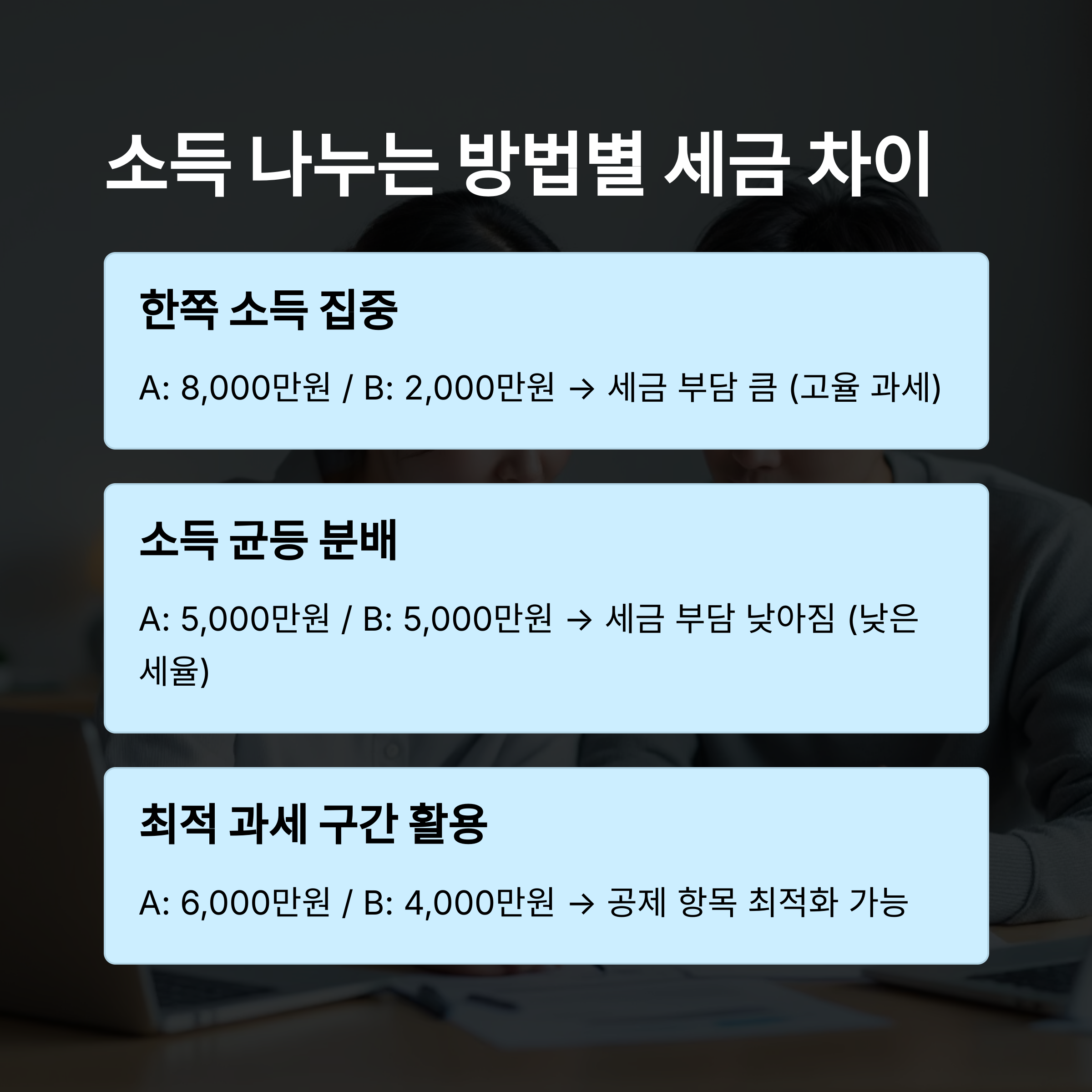 | 소득 균등 분배 | A: 5,000만 원 / B: 5,000만 원 | 세금 부담 낮아짐 (각자 낮은 세율 적용) |
