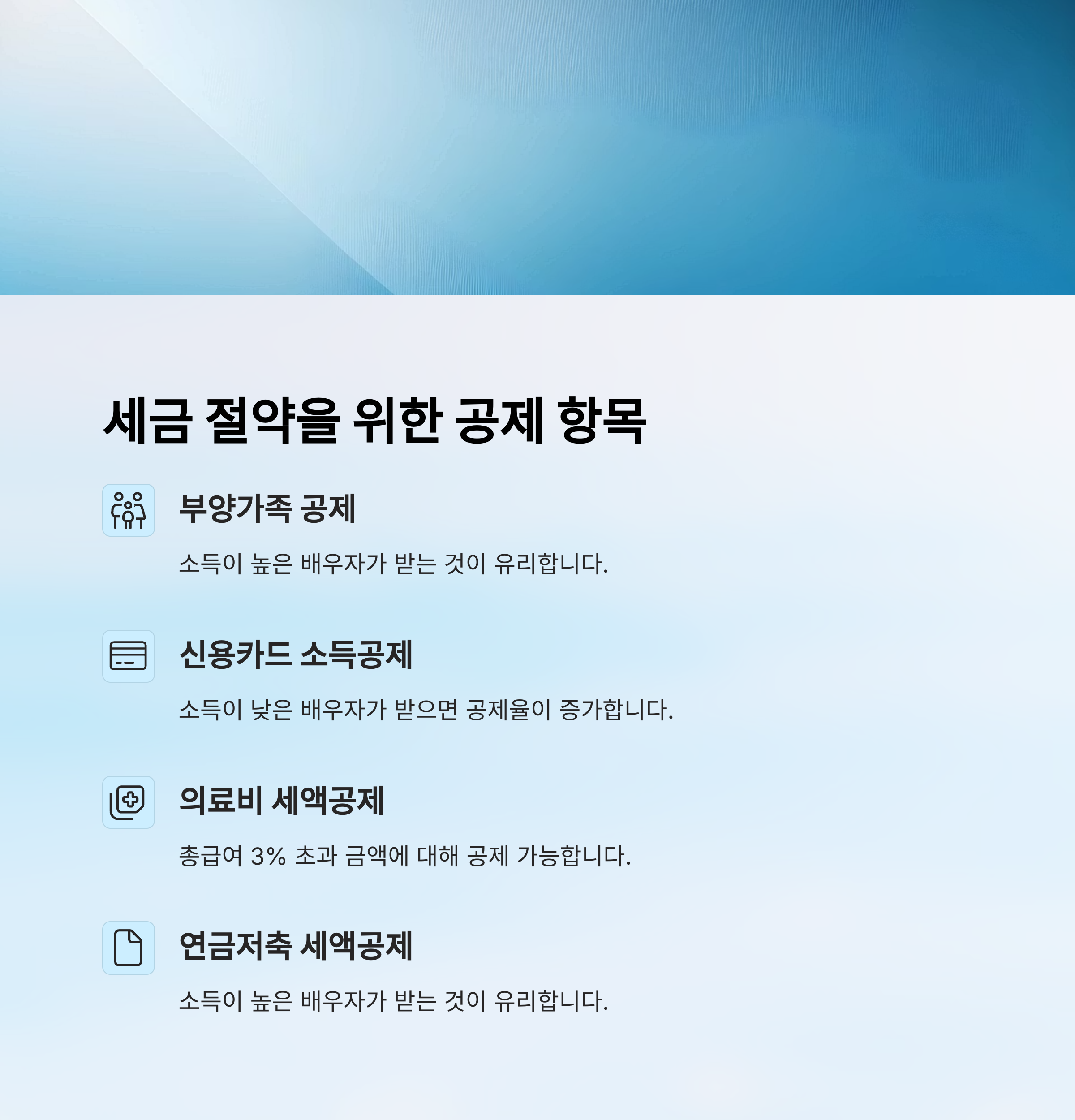 위 공제 항목들은 부부의 소득 상황에 따라 전략적으로 활용하면 세금 절감 효과를 극대화할 수 있어요.