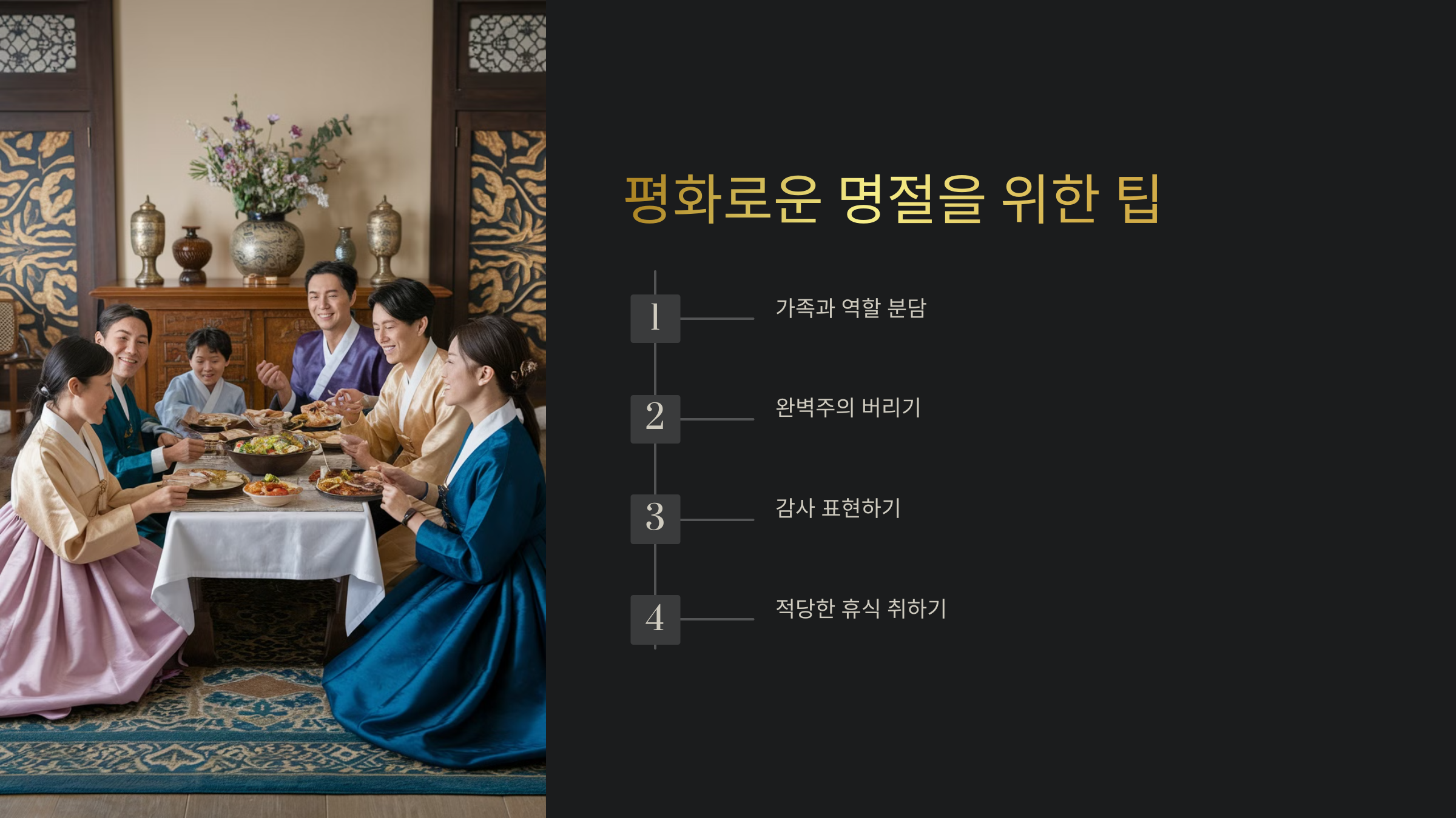 두 번째로는 명절을 완벽하게 보내야 한다는 생각을 버리는 것이 좋아요. 명절은 모든 것을 완벽히 하기보다는 서로를 이해하고 함께하는 시간을 즐기는 데 의미가 있어요. 때로는 작은 실수나 계획 변경도 즐거운 추억으로 남을 수 있답니다.
