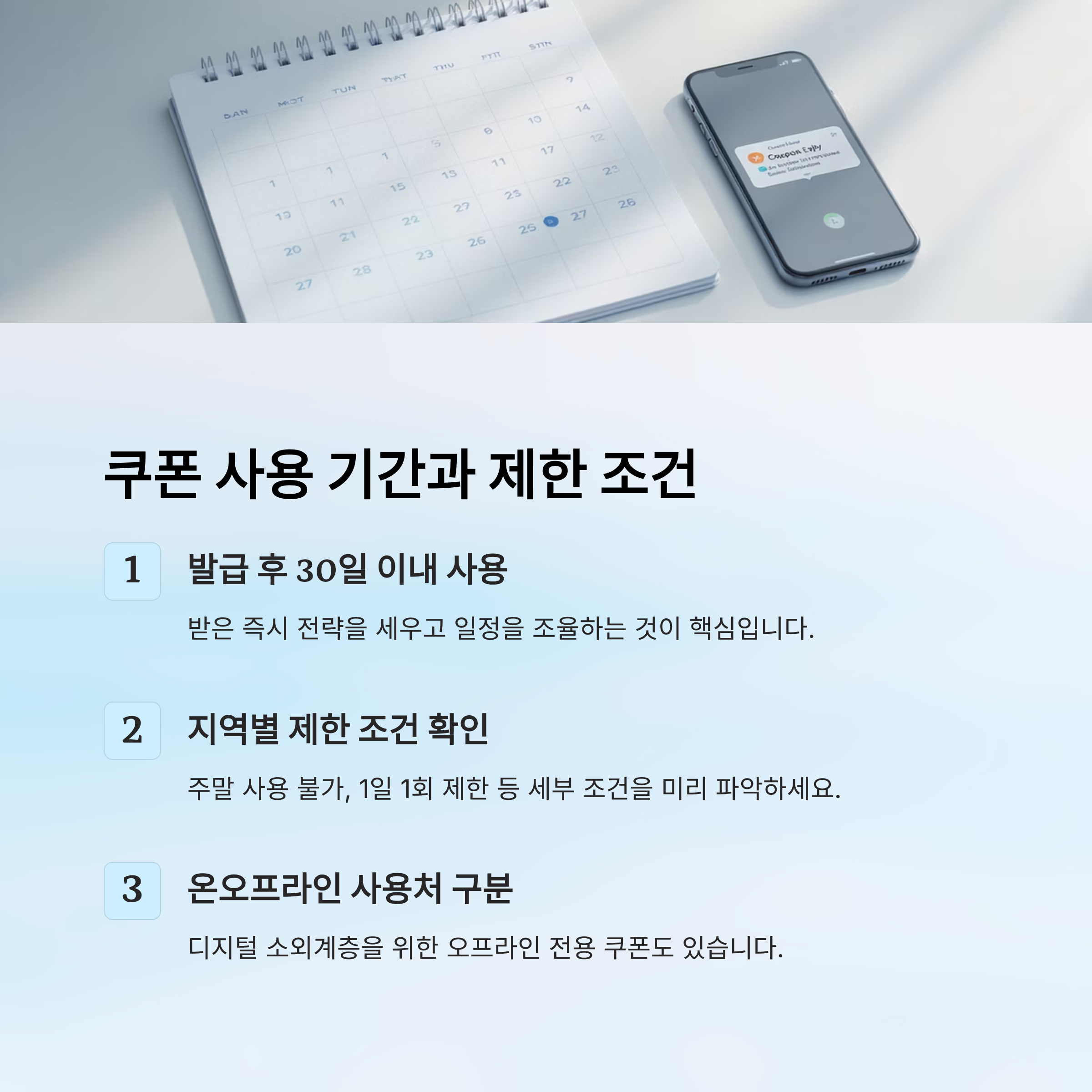 일부 지역은 주말이나 공휴일에 사용 불가 조건이 있고, 일부 사용처는 1일 1회만 적용되는 경우도 있어요. 이런 제한을 모르고 있다가 쿠폰을 날리는 경우도 많죠. 😢