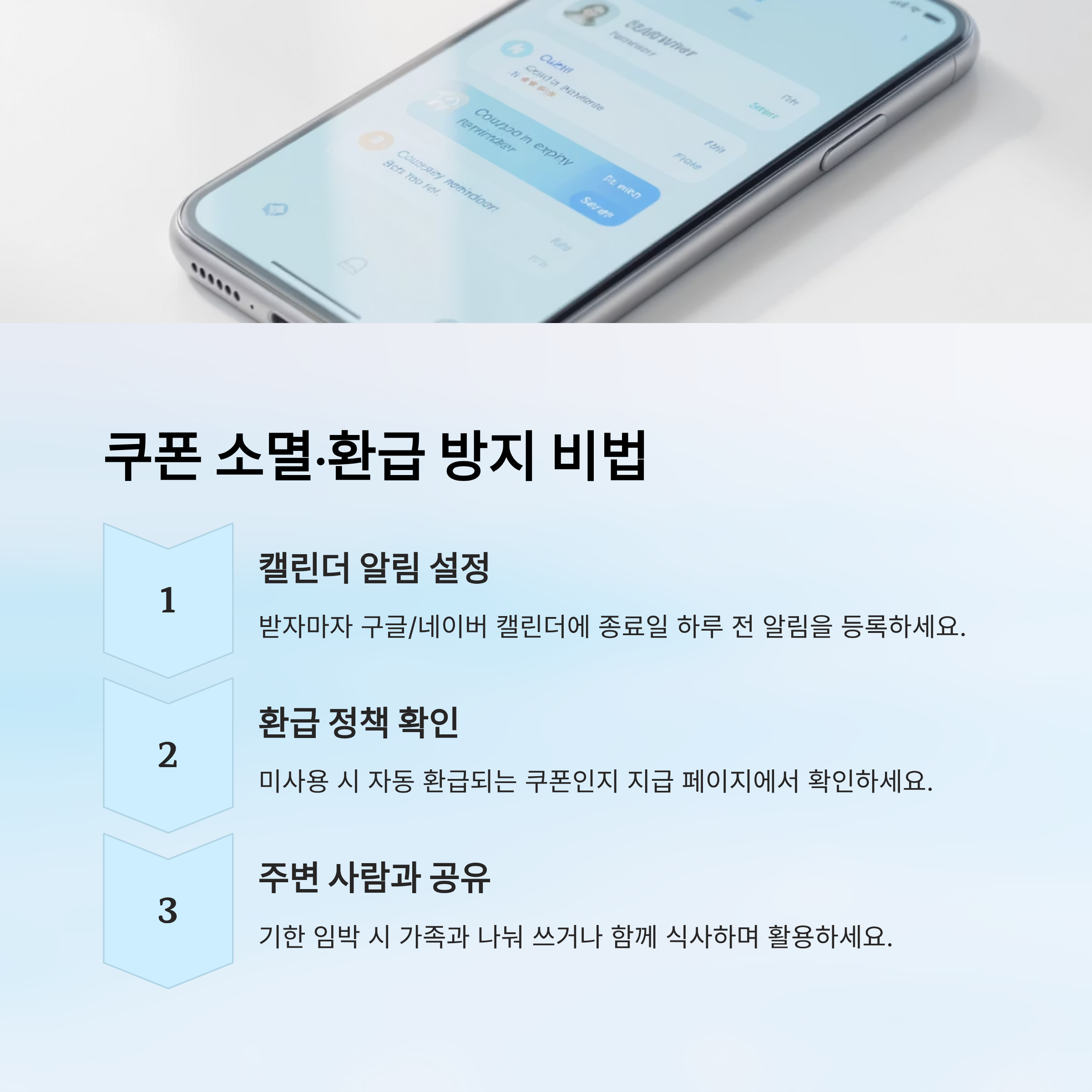 먼저, 쿠폰을 받자마자 캘린더에 기한을 등록해두는 습관을 들이세요. ‘구글 캘린더’나 ‘네이버 캘린더’에 알림 설정만 해놔도 잊지 않고 사용할 수 있어요. 특히 쿠폰 종료일 하루 전에 알림 오도록 해두면 확실히 효과 있어요!