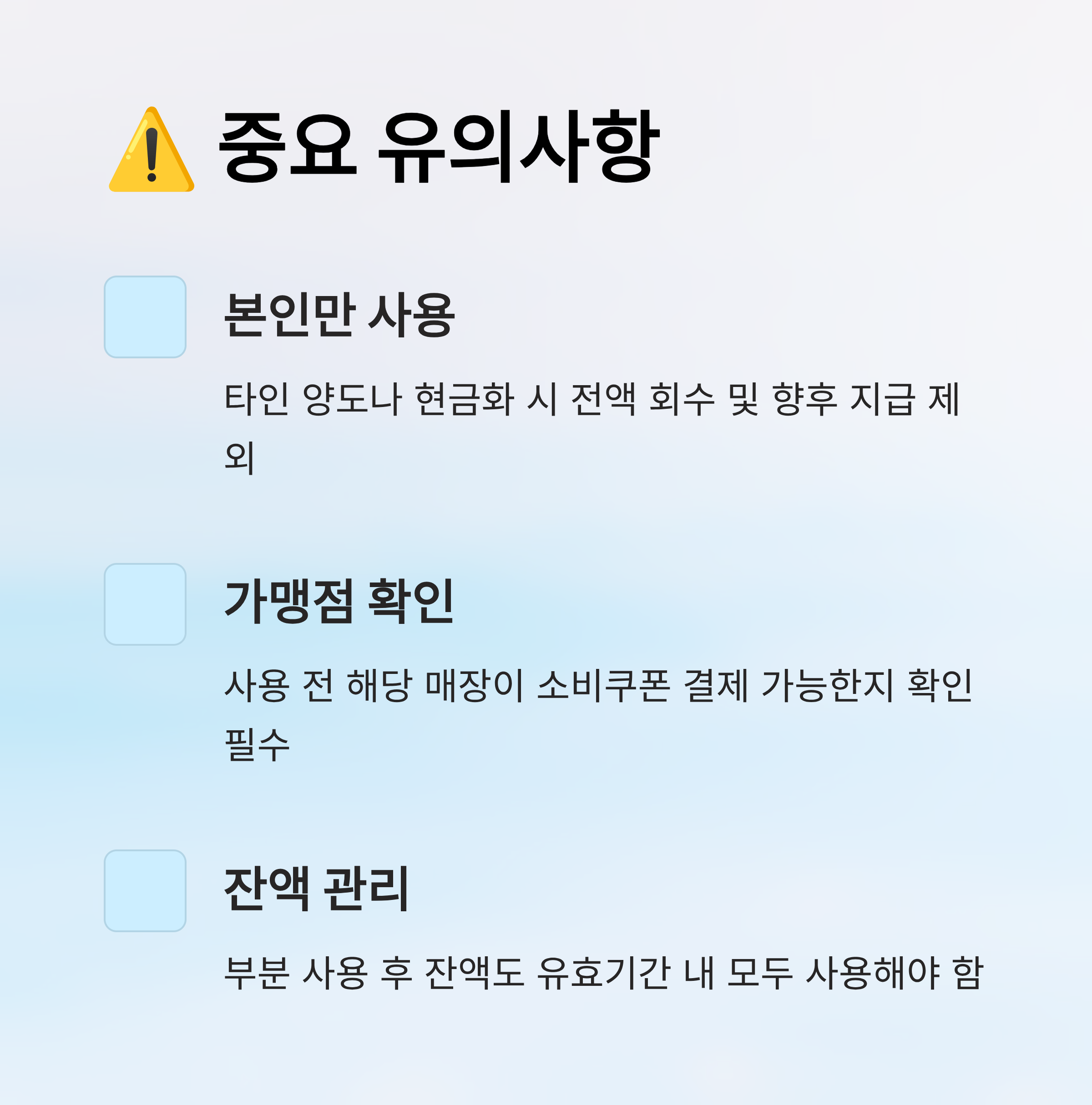 예를 들어 A 지자체에서는 발급일 기준 20일, B 지역은 15일 내 사용 제한이 있는 경우도 있어요. 공통적으로는 유효기간이 지나면 잔액은 전액 소멸되며, 환불이나 환급이 불가하다는 점을 꼭 기억하세요!