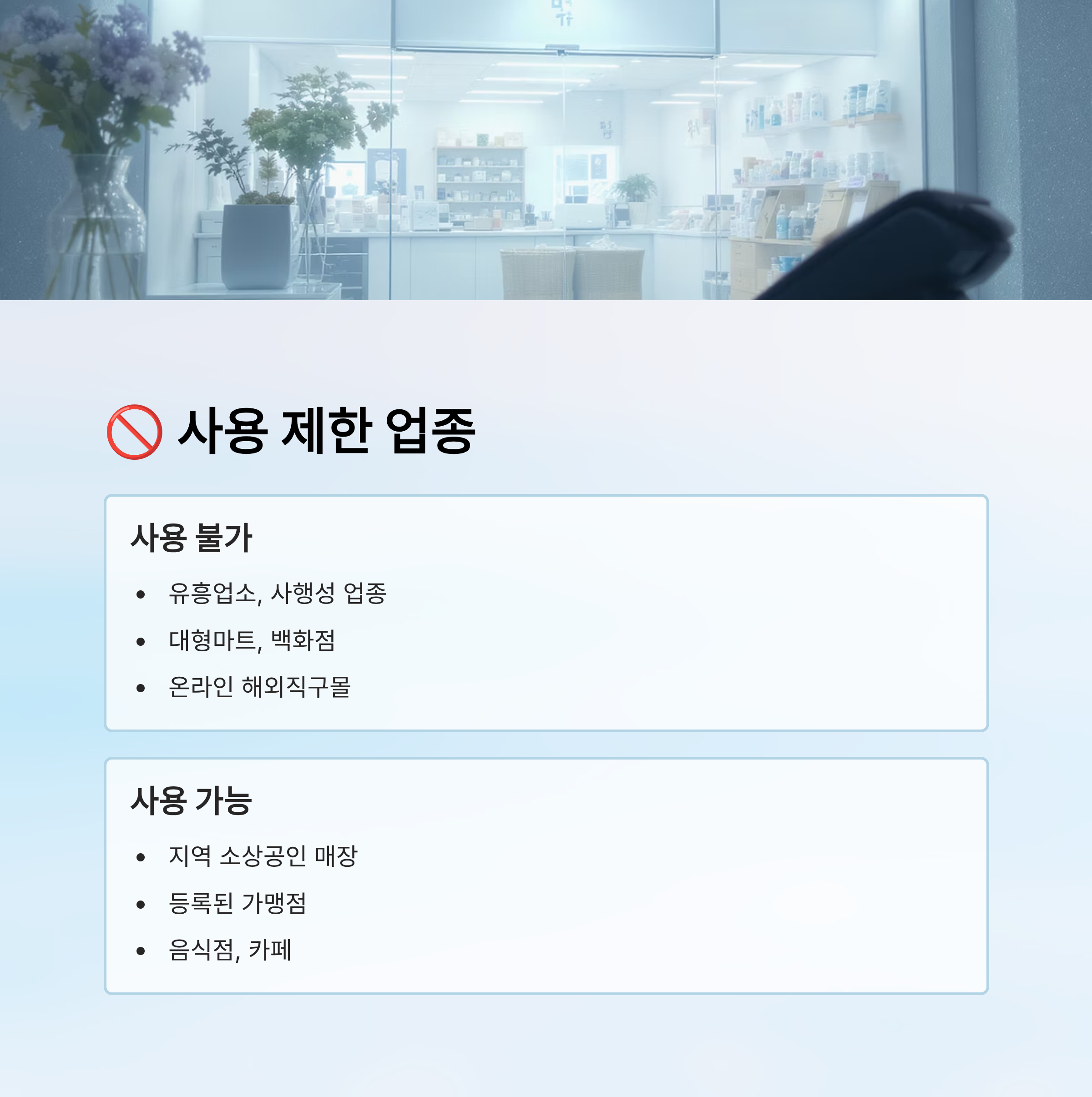 A4. 대형마트, 백화점, 유흥업소, 사행성 업소, 온라인 해외직구몰 등에선 사용이 제한돼요.