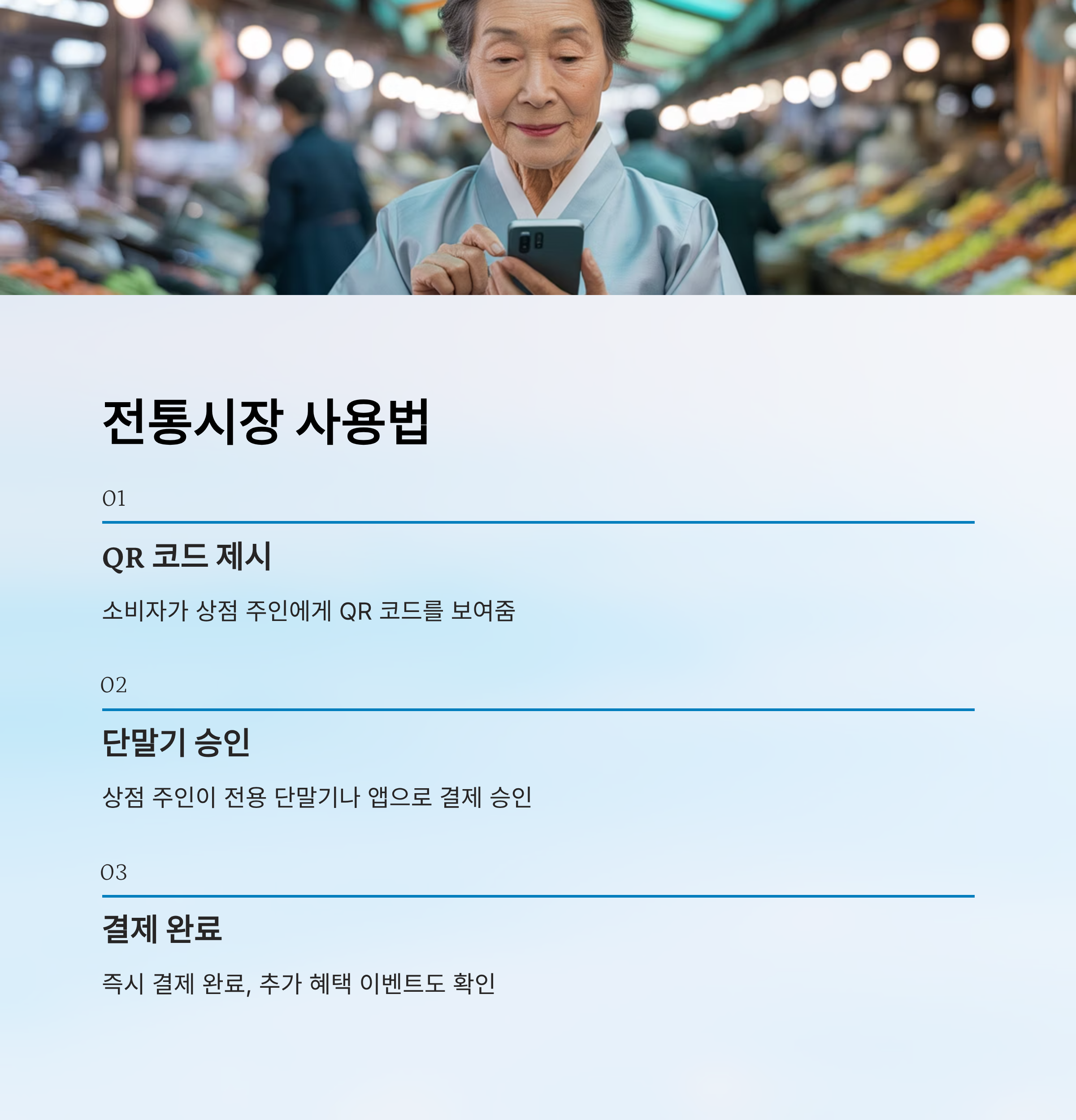 사용 방식은 굉장히 간단해요. 소비자가 QR 코드를 상점 주인에게 보여주면, 주인이 전용 단말기나 앱으로 결제를 승인해요. 일부 시장에서는 제로페이와 연동되어 있어 소비자의 모바일 앱을 통해 자동 결제도 가능하답니다.
