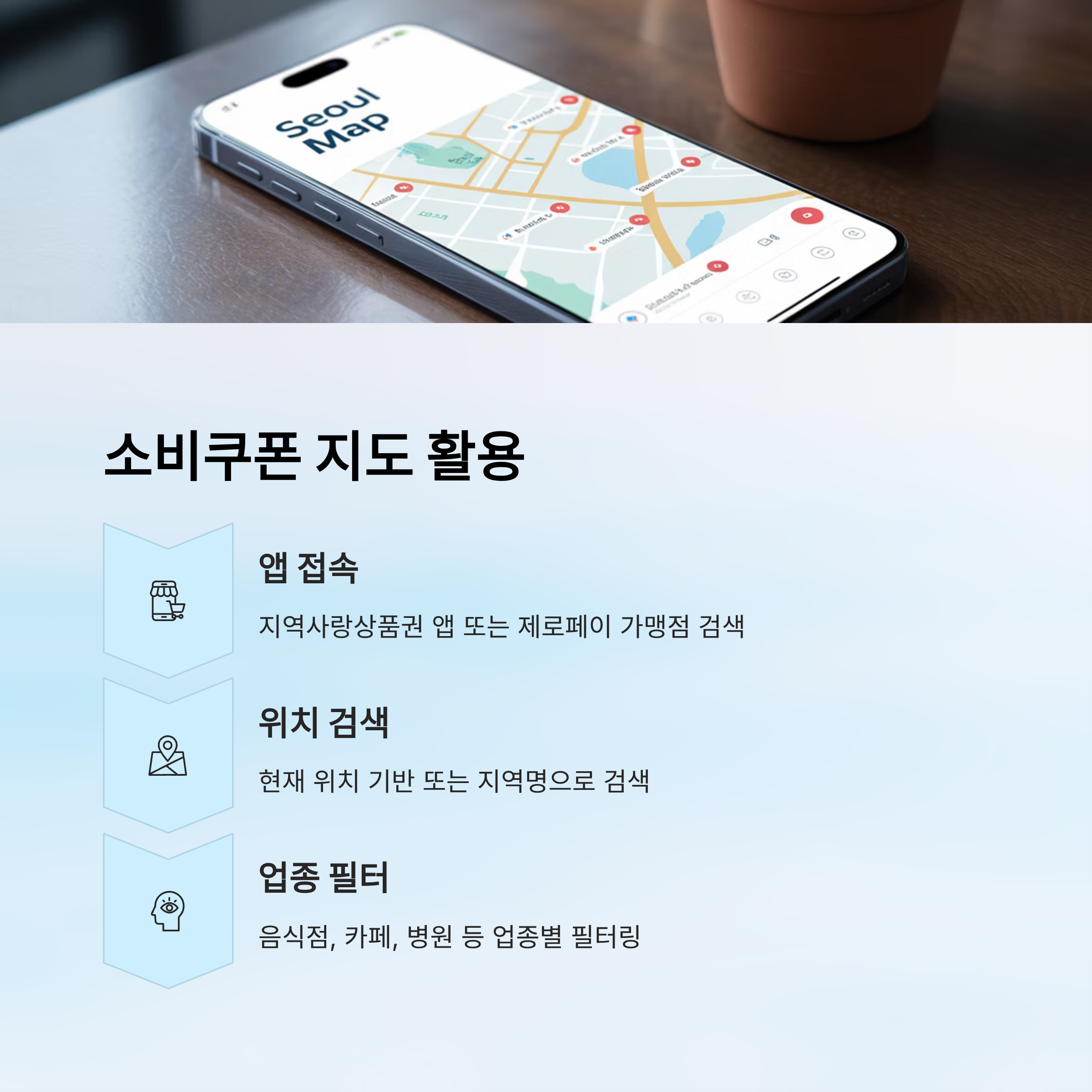 민생회복 소비쿠폰의 가장 편리한 기능 중 하나가 바로 ‘소비쿠폰 가맹점 지도 서비스’예요. 각 지역별 가맹점을 실시간으로 검색할 수 있도록 지자체 또는 제로페이, 지역사랑상품권 플랫폼을 통해 지도가 제공되고 있어요.