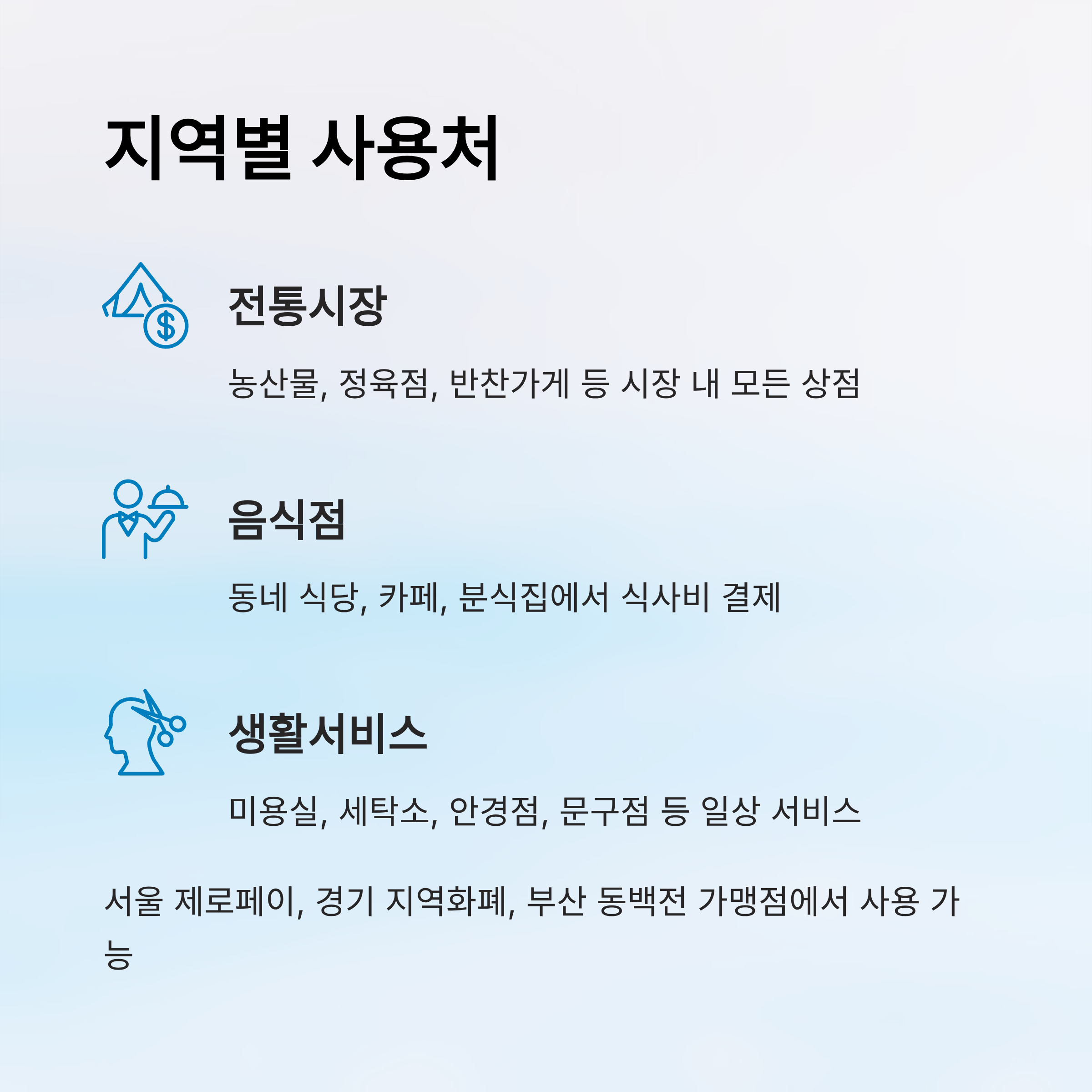 서울에서는 ‘제로페이 가맹점’, 경기지역은 ‘경기지역화폐 가맹점’으로 등록된 상점에서 사용이 가능하고, 부산은 ‘동백전 가맹점’에서 사용할 수 있어요. 각 지자체 홈페이지나 전용 앱을 통해 상세 가맹점 목록을 확인할 수 있어요.