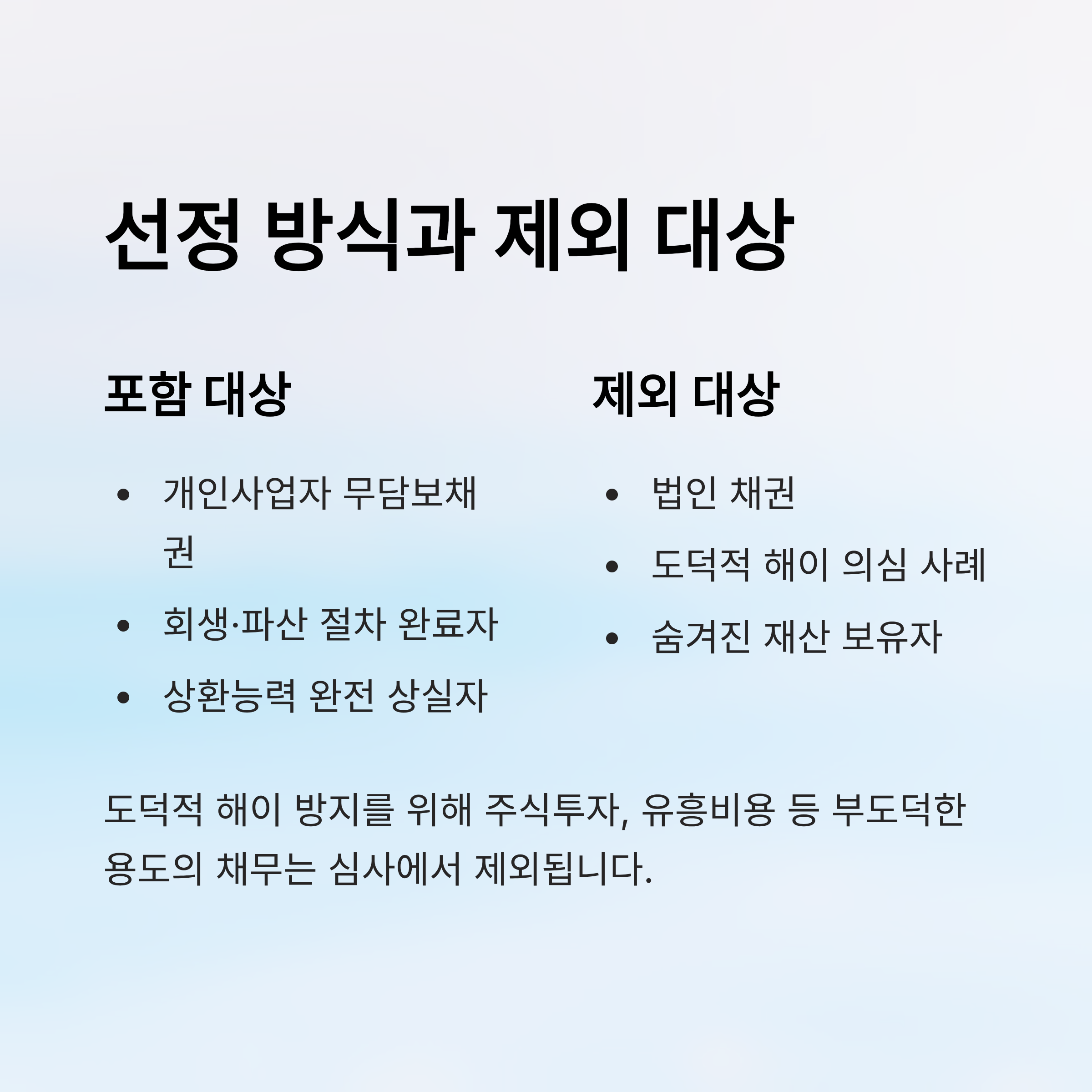 넷째, 도덕적 해이를 방지하기 위해 부도덕한 용도로 빚이 발생했거나 숨겨진 재산이 확인되면 탕감 대상에서 제외돼요. 예를 들어 주식투자, 유흥비용 등으로 사용한 채무는 심사에서 제외된답니다.