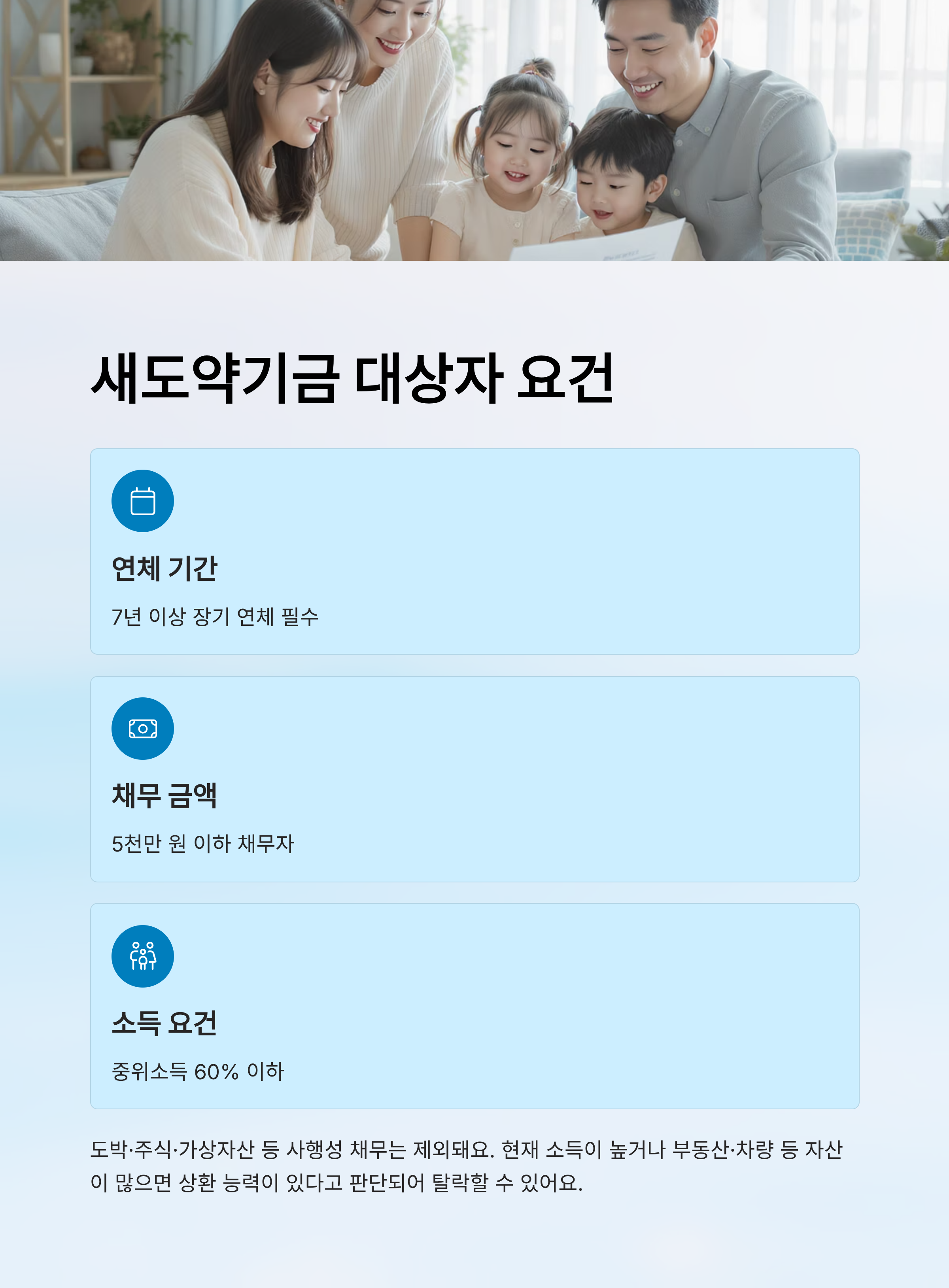 ③ 채무 종류: 무담보, 생계형 채무만 해당돼요. 카드값, 신용대출은 포함되지만, 담보대출은 제외돼요.