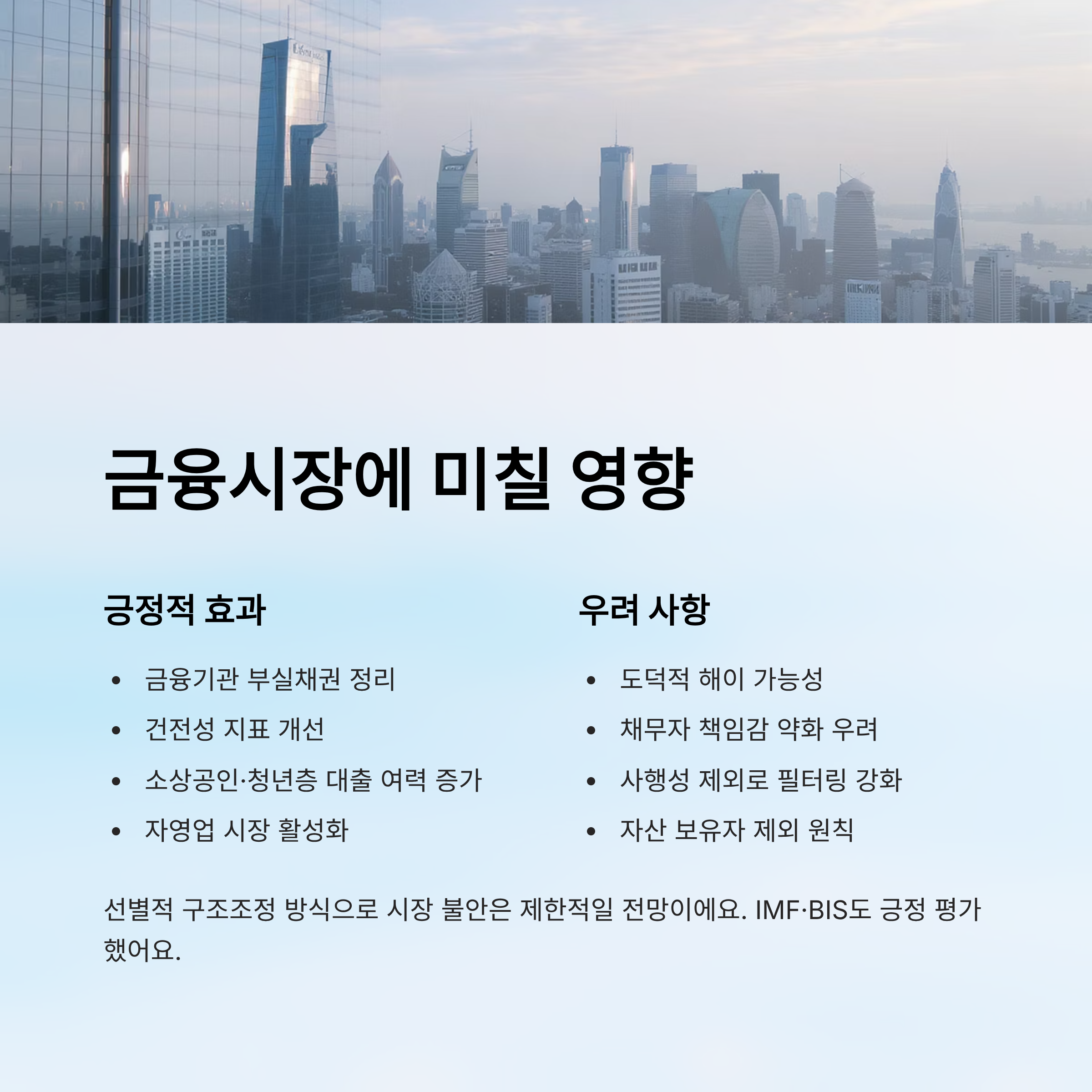전체적으로는 “선별적 구조조정” 방식이기 때문에 시장 불안은 제한적일 것으로 보여요. 실제로 IMF, BIS(국제결제은행) 등도 이런 모델을 긍정적으로 평가한 바 있어요.
