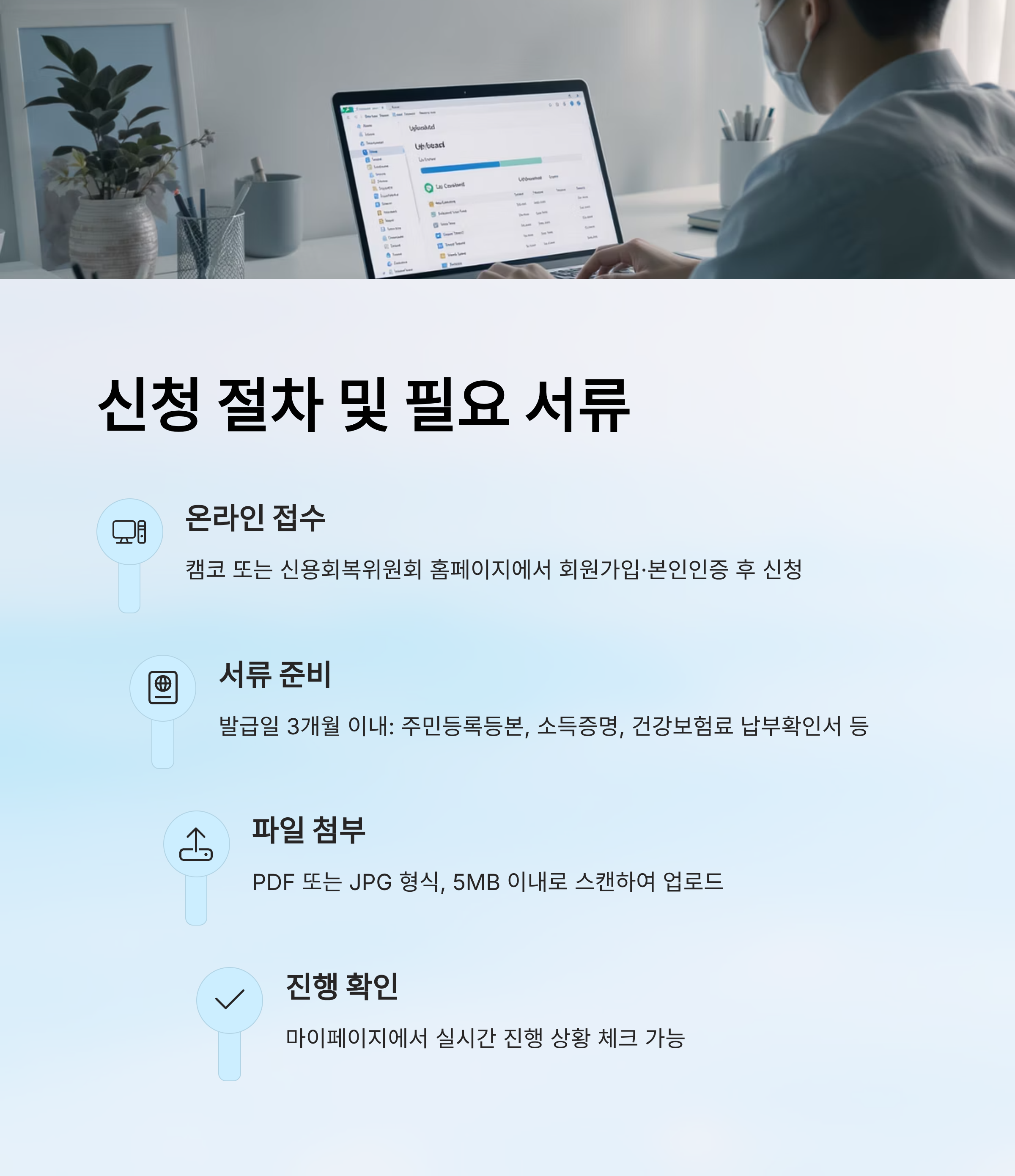 파일은 스캔하거나 사진을 찍어서 PDF 또는 JPG 형식으로 첨부하면 돼요. 각 파일은 5MB 이내로 제한되며, 마이페이지에서 진행 상황을 실시간으로 확인할 수 있어요. 전화나 카카오톡 상담도 가능하니 막히는 부분 있으면 바로 문의해보는 것도 좋아요.