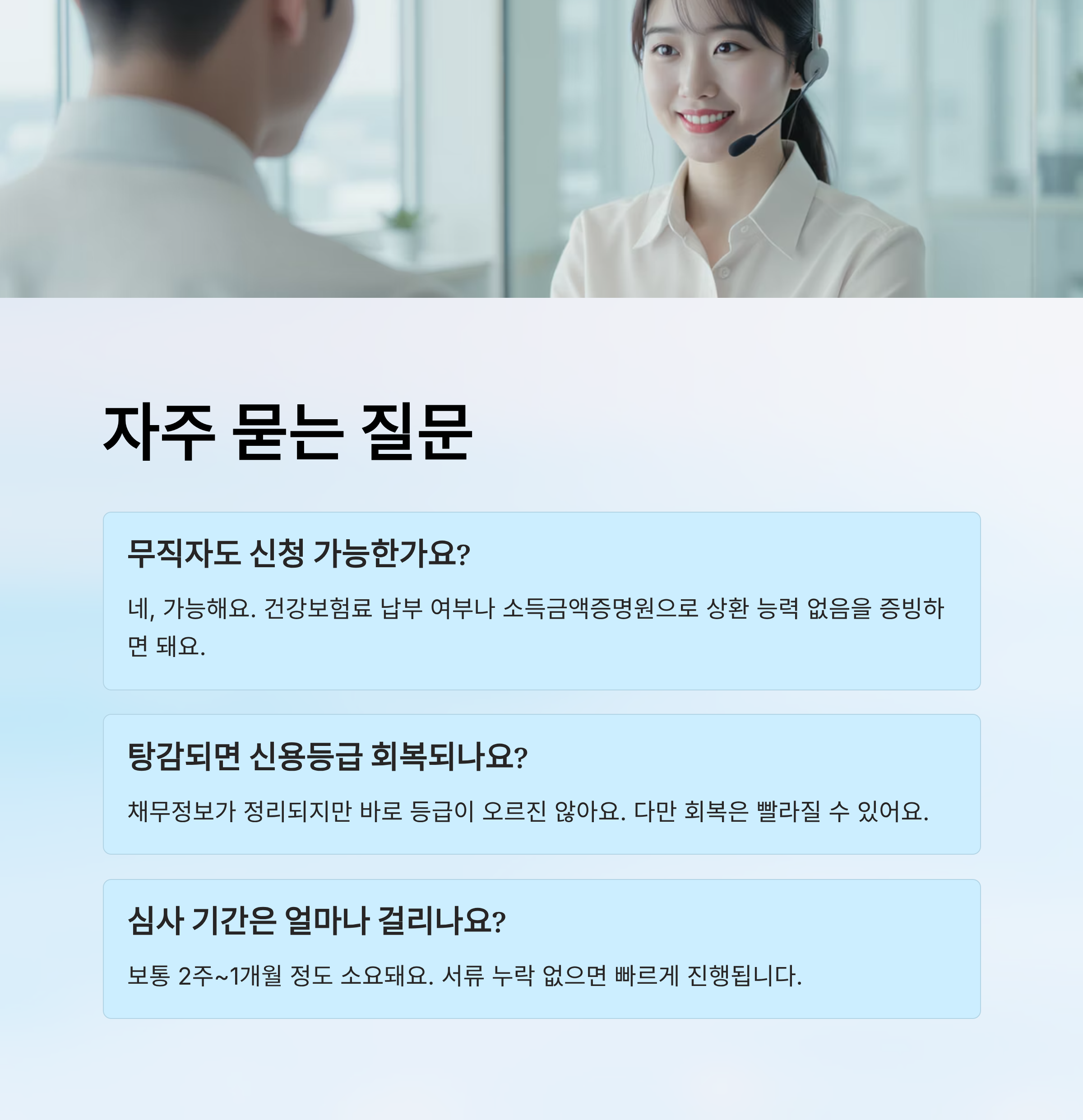 A4. 채무 조정이 완료되면 채무정보가 정리되지만, 바로 등급이 올라가진 않아요. 다만 회복은 빨라질 수 있어요.