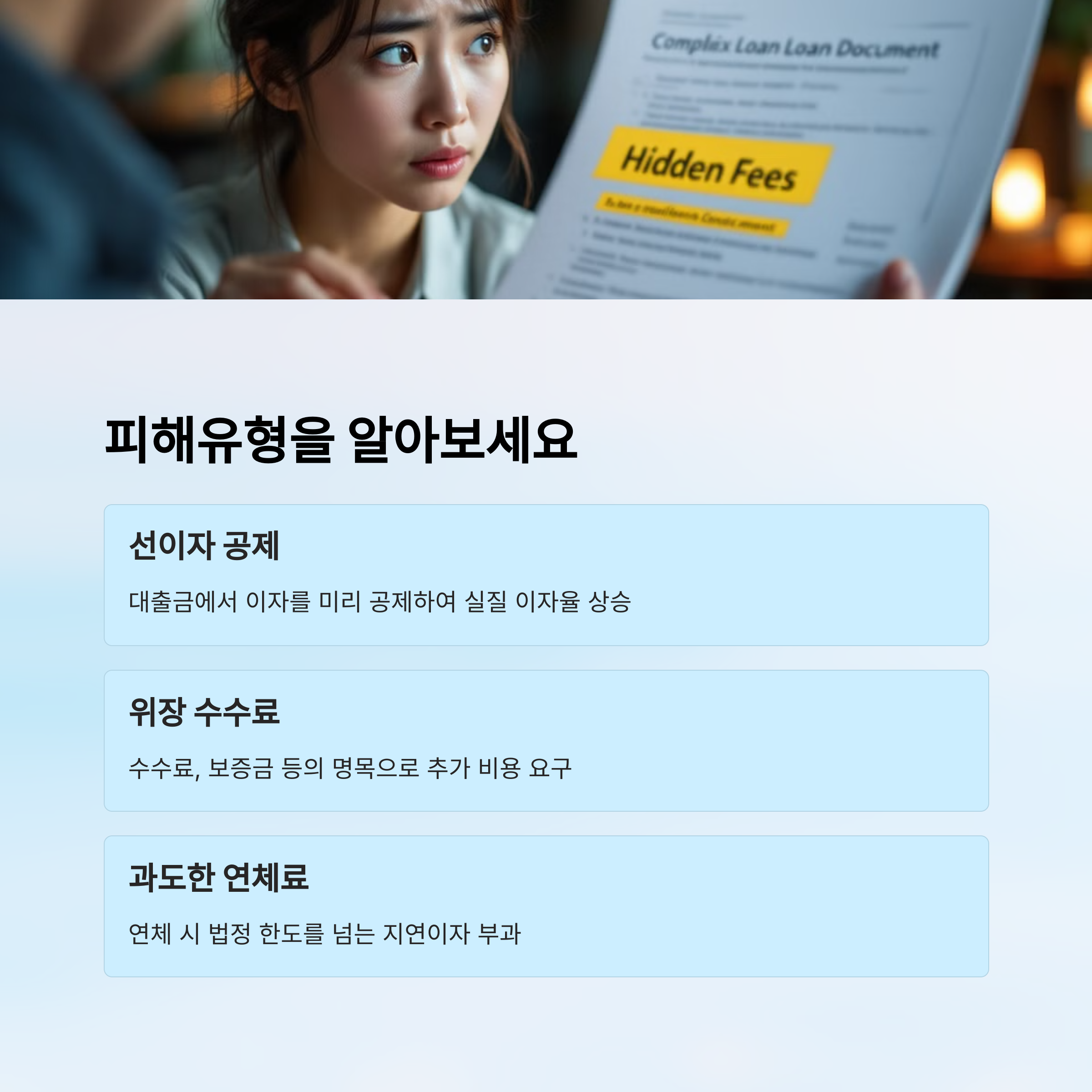 또 다른 피해 유형은 '수수료 가장'이에요. 이자 대신 '알선비' '상담비' 등의 명목으로 일정 금액을 먼저 공제하고 대출해주는 방식이에요. 예를 들어 100만 원 빌려준다고 해놓고 80만 원만 지급하면서 수수료 20만 원을 미리 뺀다면, 실제 이자율은 훨씬 높아지죠.
