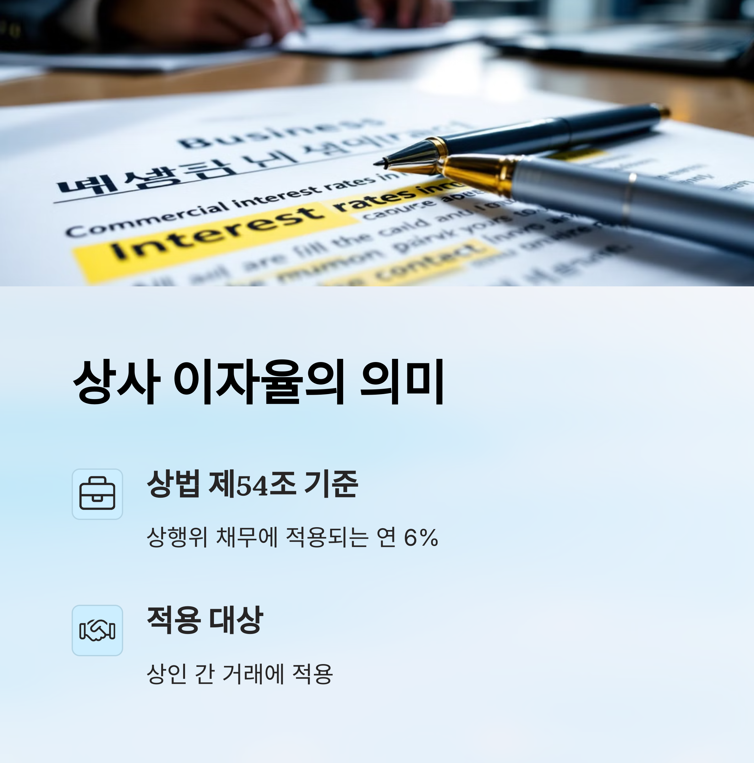 반면 상사 이자율은 사업자 간 물품거래 대금, 외상매입금, 계약금 지연 지급 등 상거래 상황에서 적용돼요. 이자율 약정이 없을 때는 상법 제54조에 따라 연 6%가 기준이 되는 거예요.