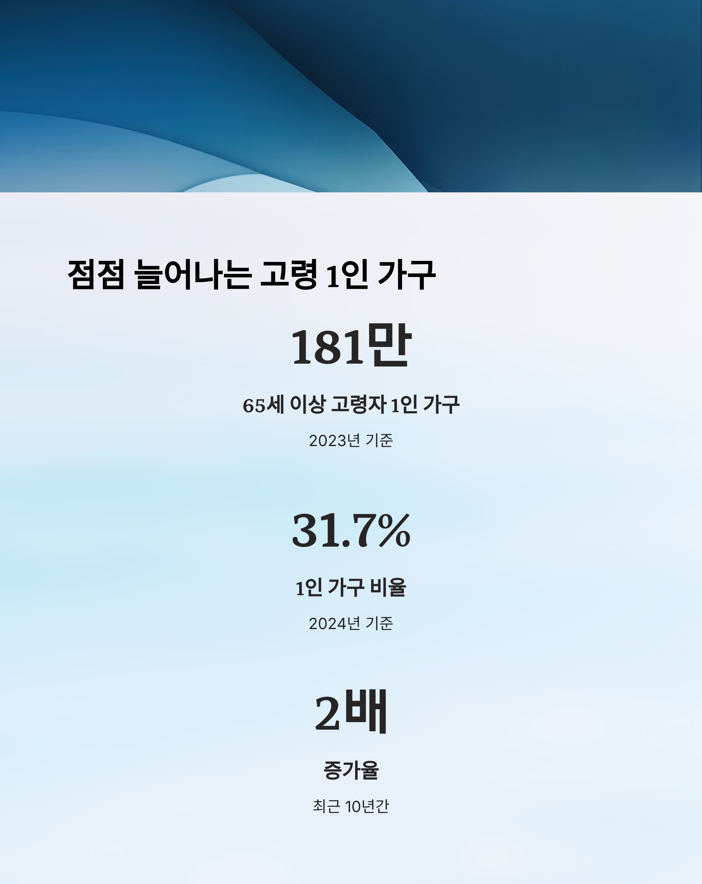 우리 사회는 빠르게 고령화되고 있고, 1인 가구도 꾸준히 증가하고 있어요. 핵가족화와 도시화로 인해, 예전처럼 가족들이 항상 함께 있는 구조는 점점 줄어들고 있죠.