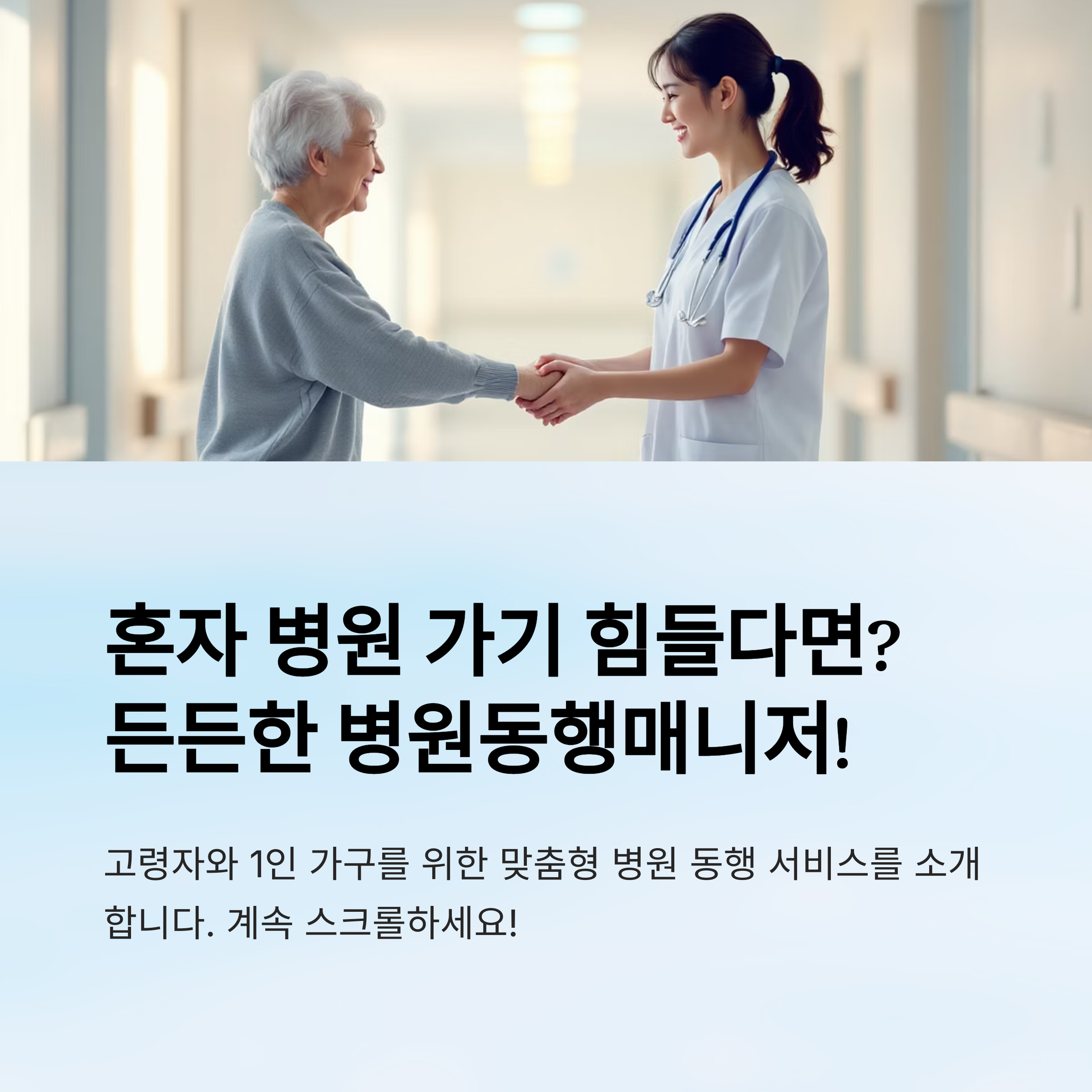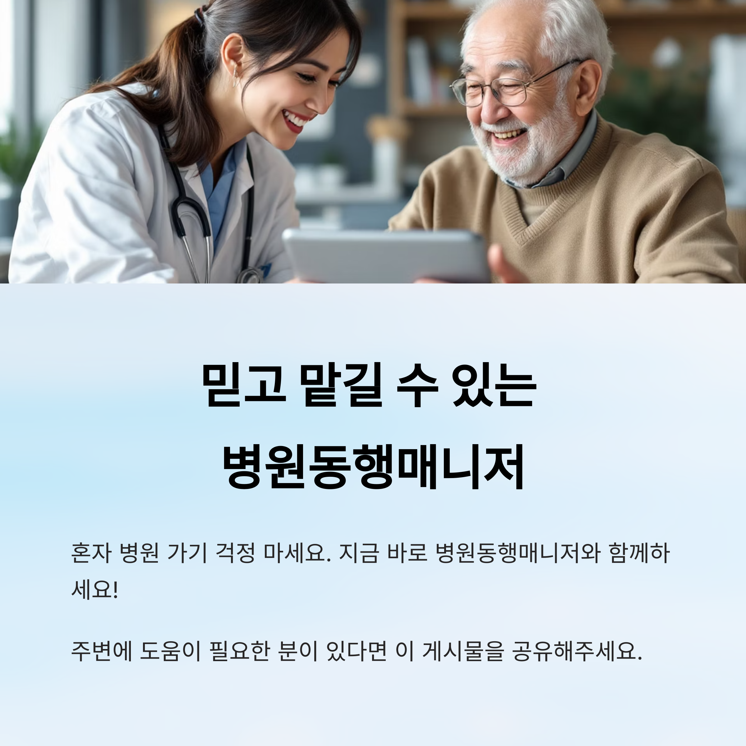 이제 병원동행매니저와 함께라면 혼자 병원 가는 게 두렵지 않아요! 필요할 땐 꼭 이용해보세요.👩⚕️