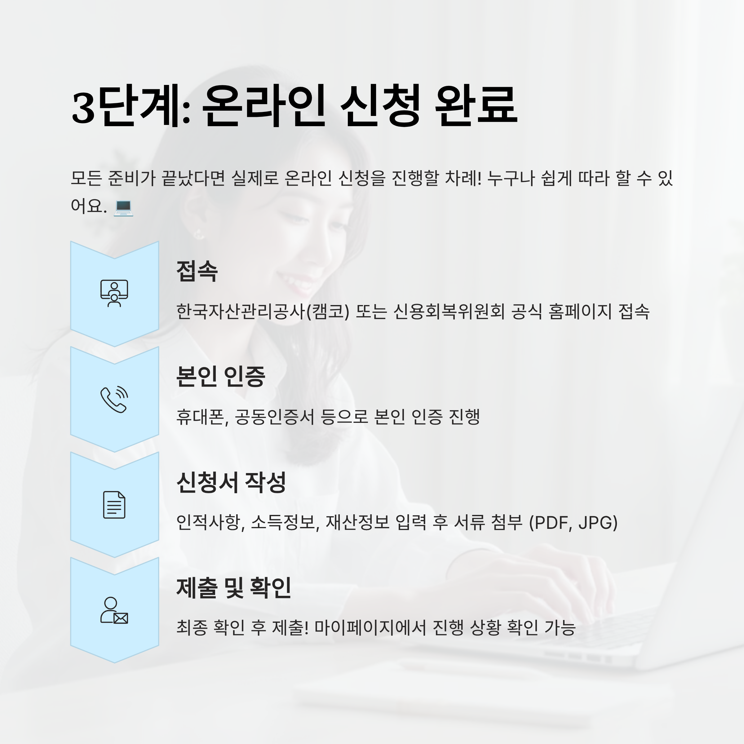 한국자산관리공사(캠코)나 신용회복위원회 사이트에서 온라인 신청을 진행해요. 스캔 또는 사진으로 서류 첨부도 가능!